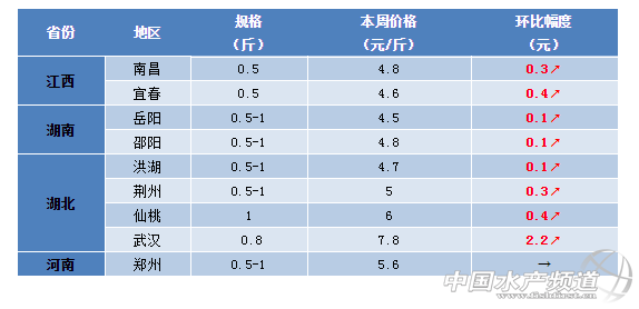 | 中國水產(chǎn)頻道原創(chuàng)報道, 最近多地鯽魚行情再次出現(xiàn)大漲!6月7日,湖北武漢地區(qū)8兩的鯽魚已經(jīng)漲到7.8元/斤,較之前最大漲幅達(dá)到2.2元/斤;目前淮安地區(qū)的鯽魚價格較年前已經(jīng)上漲了約一倍, 7-8兩的鯽魚賣到7.5元/斤;遼寧沈陽地區(qū)1斤以上的鯽魚塘頭價已經(jīng)可以賣到7.8元/斤;最近湖南長沙地區(qū)鯽魚走量非常大,預(yù)計鯽魚價格上漲也不遠(yuǎn)了。 文/ 水產(chǎn)前沿 鄭鵬飛 一周要聞 在端午節(jié)消費刺激下,近期水產(chǎn)品市場消費火爆,多個品種價格行情出現(xiàn)暴漲。據(jù)了解,最近多地鯽魚行情再次出現(xiàn)上漲。目前,廣東中山地區(qū)0.5斤的鯽魚塘頭價已經(jīng)基本突破6元/斤,養(yǎng)殖戶表示近期廣西桂林、貴港等地區(qū)有不少魚車找魚,目前來賓地區(qū)鯽魚塘頭價賣到6.5元/斤。最近江西南昌地區(qū)鯽魚價格也總算是漲了,0.5斤的鯽魚塘頭價漲到4.8元/斤。據(jù)了解,前天(6月7日),湖北武漢地區(qū)8兩的鯽魚已經(jīng)漲到7.8元/斤,較之前最大漲幅達(dá)到2.2元/斤,目前4-7兩的鯽魚也賣到6-6.5元/斤。養(yǎng)殖戶表示,最近湖南長沙地區(qū)鯽魚走量非常大,預(yù)計鯽魚價格上漲也不遠(yuǎn)了。近期江蘇泰州地區(qū)鯽魚價格再次上漲0.2元/斤,8兩鯽魚最新報價7.2元/斤,7兩的賣到6.6元/斤,6兩的可以賣到6元/斤。截止目前,淮安地區(qū)的鯽魚價格較年前已經(jīng)上漲了約一倍,現(xiàn)在7-8兩的鯽魚塘頭價可以賣到7.5元/斤。據(jù)養(yǎng)殖戶介紹,近期遼寧沈陽地區(qū)鯽魚價格也漲了,雖然目前一些專坑鯽魚還是維持在6.5元/斤封頂?shù)臓顟B(tài),但是有部分地區(qū)1斤以上的鯽魚塘頭價已經(jīng)可以賣到7.8元/斤。近期各地鯽魚行情回暖的趨勢仍然比較明顯,預(yù)計行情有望繼續(xù)上漲。 需要注意的是,端午節(jié)前后華南多地遭遇暴雨侵襲,珠三角的海鱸、草魚、生魚以及陽江海水網(wǎng)箱養(yǎng)殖遭到重創(chuàng),陽江地區(qū)泥猛、紅魚、白花魚、三刀魚受災(zāi)最為嚴(yán)重,有養(yǎng)殖戶損失近300萬。6月10-12日,強降雨區(qū)將南壓至華南南部, 預(yù)計6月10日,福建、江西南部、廣東北部和西部、廣西東部等地的部分地區(qū)有暴雨或大暴雨,局部累計雨量可達(dá)300-500毫米。一朝養(yǎng)魚,夜夜無眠!近段時間隨著氣溫升高和天氣的不穩(wěn)定,養(yǎng)殖戶更是睡不好覺,生怕一個不小心回到解放前。致富道路千萬條,安全第一條。建議大家近期適當(dāng)賣魚,以減小存塘風(fēng)險。 本周行情 華南地區(qū) 本周華南地區(qū)鯽魚行情整體穩(wěn)中有升。據(jù)了解,最近幾天廣東中山地區(qū)鯽魚漲了,目前大部分地區(qū)0.5斤的鯽魚塘頭價已經(jīng)突破6元/斤。近期廣西地區(qū)鯽魚整體行情還是保持穩(wěn)定,其中來賓地區(qū)鯽魚最新塘頭價6.5元/斤;桂林、貴港等地區(qū)的鯽魚塘頭價還是保持穩(wěn)定,不過養(yǎng)殖戶表示近期魚車找魚較之前多了。本周肇慶地區(qū)鯽魚塘頭價和上周基本持平,目前1斤的最新報價8.5選/斤,0.5斤的賣6.5元/斤。端午節(jié)前后這段時間里,華南多地遭遇暴雨侵襲,珠三角的海鱸、草魚、生魚以及陽江海水網(wǎng)箱養(yǎng)殖遭到重創(chuàng),陽江地區(qū)泥猛、紅魚、白花魚、三刀魚受災(zāi)最為嚴(yán)重,有養(yǎng)殖戶損失近300萬。6月10-12日,強降雨區(qū)將南壓至華南南部, 預(yù)計6月10日,福建、江西南部、廣東北部和西部、廣西東部等地的部分地區(qū)有暴雨或大暴雨,局部累計雨量可達(dá)300-500毫米,建議近段時間適當(dāng)賣魚以減小存塘風(fēng)險。 華中地區(qū) 本周華中地區(qū)的鯽魚行情出現(xiàn)明顯好轉(zhuǎn),多個地區(qū)鯽魚價格出現(xiàn)上漲。據(jù)養(yǎng)殖戶介紹,最近江西南昌地區(qū)鯽魚價格漲了,0.5斤的鯽魚塘頭價可以買到4.8元/斤;前天(6月7日),湖北武漢地區(qū)8兩的鯽魚已經(jīng)漲到7.8元/斤,4-7兩的賣6-6.5元/斤;目前隨州地區(qū)最新報價6元/斤左右;最近湖南長沙地區(qū)鯽魚價格相對穩(wěn)定,但是走量非常大,存塘逐步減少,養(yǎng)殖戶表示預(yù)計鯽魚價格上漲也不遠(yuǎn)了,目前常德地區(qū)鯽魚的塘頭價還是變化不大。 華東地區(qū) 本周華東地區(qū)的鯽魚行情繼續(xù)保持上漲趨勢。據(jù)了解,最近福建南平地區(qū)的鯽魚塘頭價還是老樣子,目前最新報價6-6.5元/斤;近期江蘇泰州地區(qū)鯽魚價格上漲0.2元/斤,8兩鯽魚最新報價7.2元/斤,7兩的賣到6.6元/斤,6兩的可以賣到6元/斤;據(jù)養(yǎng)殖戶介紹,目前淮安地區(qū)的鯽魚價格較年前漲了約一倍,現(xiàn)在7-8兩的鯽魚塘頭價可以賣到7.5元/斤;本周無錫地區(qū)的鯽魚行情基本保持穩(wěn)定,價格暫時沒有明顯變化。 其他地區(qū) 本周西北地區(qū)、華北地區(qū)以及西南地區(qū)的鯽魚行情沒有出現(xiàn)太大變化。據(jù)流通商介紹,目前甘肅蘭州市場鯽魚最新報價穩(wěn)定在7元/斤左右;最近河北唐山地區(qū)鯽魚不變,最新塘頭價穩(wěn)定在5元/斤左右;近期四川德陽、綿陽、廣元以及成都地區(qū)的鯽魚塘頭價基本還是維持老樣子,養(yǎng)殖戶表示端午節(jié)期間成都市場上鯽魚的價格是漲了,但是塘頭價還是沒有明顯變化。據(jù)養(yǎng)殖戶介紹,近期遼寧沈陽地區(qū)鯽魚價格漲了,雖然一些專坑鯽魚還是維持在6.5元/斤,但是部