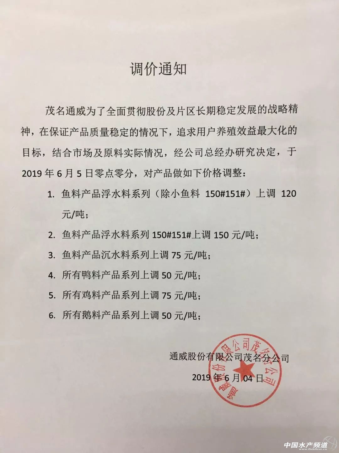 | 中國水產頻道獨家報道, 6月11日,海大水產料正式漲價! 文/ 水產前沿 整理 6月12日,水產料漲價勢頭仍在持續,范圍已由廣東蔓延至福建市場。據了解,目前三明海大、福州通威威廉、福建粵海、福州恒興、福建澳華等企業都已上調普水料的價格,漲幅一致,為顆粒料上漲75元/噸、膨化料上漲120元/噸。廈門通威還沒調價,但近日內也會動。 三明海大飼料有限公司漲價通知 福建通威威廉飼料有限責任公司漲價通知 在此之前,陸續已有多個料企上調了水產飼料價格,包括通威、大北農、新希望等。其中上漲最大幅度的為生魚料,最高上調450元/噸。 通威股份有限公司茂名分公司調價通知 武漢大北農水產科技有限公司飼料價格調整通知 豐順新希望生物有限公司調價通知 尊敬的客戶: 因原料價格大幅度上漲,為了保證產品質量,經公司研究決定,于2019年6月10日7點起對公司水產料產品價格進行上調: 1、魚苗寶上調150元/噸。魚大大、魚壯壯、865羅非料上調120元/噸; 2、魚旺旺、魚種粉料、上調75元/噸; 特此通知! 豐順新希望生物有限公司 2019年6月9日 揭陽通威飼料有限公司調價通知 尊敬的各位經銷商、養殖戶朋友: 感謝大家一直以來對公司產品的支持,由于魚粉、豆粕等原料價格大幅度上漲,為保證飼料產品質量,經公司研究決定,從2019年6月5日7點起對我司產品價格進行漲價調整,各品種價格調整幅度具體如下: 浮水料上漲120元/噸; 沉水料上漲75元/噸; 其它產品價格暫不作調整; 揭陽通威飼料有限公司 2019年6月4日 揭陽國雄飼料有限公司漲價通知 尊敬的客戶: 因原料價格大幅度上漲,為了保證產品質量,經公司研究決定,于2019年6月6日7點起對公司水產料產品價格進行上調: 1、生魚料3#上調450元/噸,生魚料其他品種上調150元/噸; 2、魚苗寶上調150元/噸、其余膨化料上調120元/噸; 3、草魚顆粒料上調75元/噸; 4、肝腸健及魚蝦混養料價格暫不調整! 特此通知! 揭陽國雄飼料有限公司 2019年6月5日 |