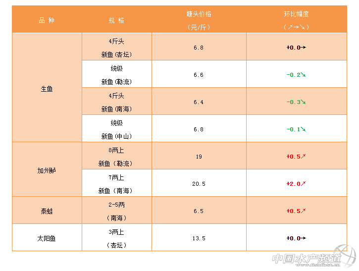 | 中國水產頻道原創報道, 文/ 珠海海龍 水產前沿 吳佳輝 淡水特種魚:近期生魚病害較多,建議養戶做好出魚規劃 生魚 順德杏壇:新魚4斤頭左右統級6.5-7.0元。分級2斤上7.5元,2斤下6元。本周價格維持穩定,之前魚中手中已經定下不少魚,目前正在消化。高溫季節到來,魚塘管理不可大意,生魚產后體質虛弱,病害較多,建議做足預防處理工作。 勒流區域:近期生魚上市量少,主要原因在于魚中基本上手頭還有魚抓,未來走勢可能略漲,但是需要根據自身情況做好出魚計劃。近期生魚散春比較厲害,體質弱,氣候多變,魚塘水質較差,問題較多。建議多強化體質,魚塘水質以提高酸堿度及降亞鹽為主。 南海西樵九江:進周魚價稍有下跌,5-6成大魚價格6.3-6.5不等,相比上周跌幅0.5元左右,終端消費一般,相比存塘流通依然還是不大,建議養戶合理的做好賣魚規劃。 中山區域:生魚價格2斤上大魚7-7.3元,2斤下5.7-5.9元,整體保持平穩,但塘頭看魚報價有高有低,養戶應按自己實際情況合理安排出魚;另外近期雨水較多,易引起水體黃濁、亞鹽氨氮超標等問題,建議做好凈水調水工作,避免出現損失。 |