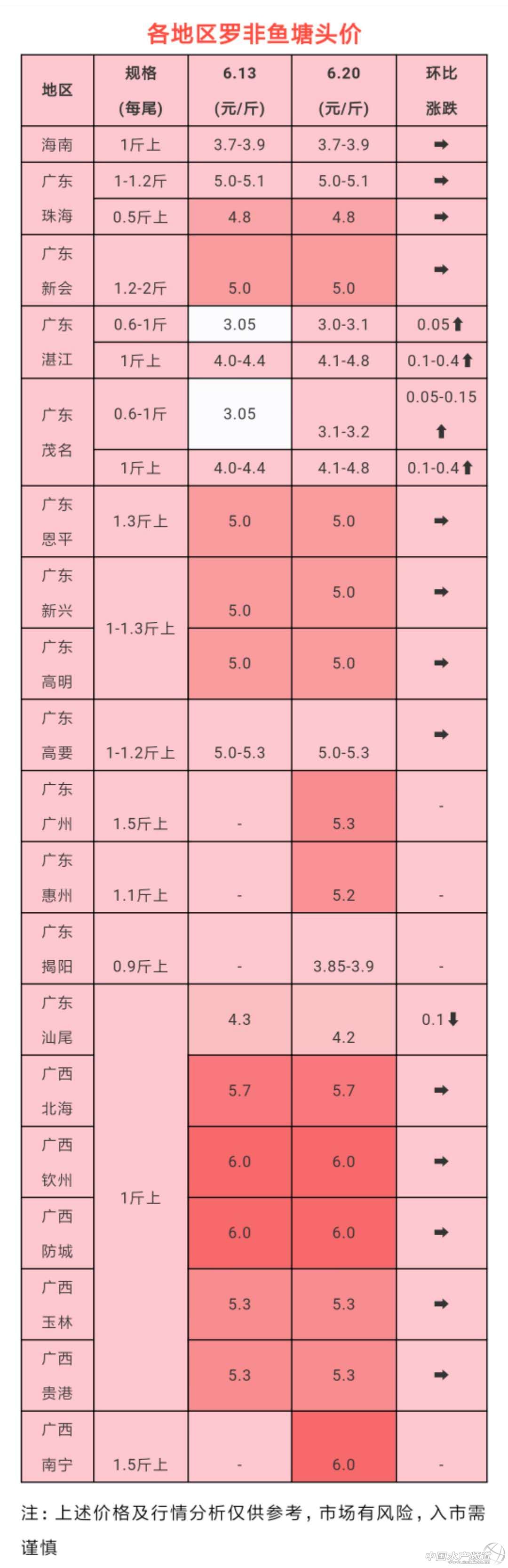 | 中國水產頻道原創報道, 本周各產區羅非魚行情一覽 文/ 水產前沿實習編輯 葉豐齊 海南地區:羅非魚保持上周價格,1斤以上規格3.7-3.9元/斤。 珠三角地區:羅非魚走市場(市場非)為主。珠海0.5斤規格4.8元/斤,1-1.2斤規格5.0-5.1元/斤;新會1.2-2斤規格羅非魚5元/斤;皆與上周價格一致。廣州增城羅非魚1.5斤以上規格收5.3元/斤,2斤以上有些能達到5.5元/斤。目前存塘量較多,較兩個月前好賣,這提高了養戶出魚的積極性。恩平1.3斤以上規格5元/斤;新興和高明1-1.3斤以上同是5元/斤;高要1-1.2斤規格5.0-5.3元/斤;整體與上周的行情保持一致。 粵東地區:惠州平均出1.1斤以上市場非,5.2元/斤;仲愷出魚規格稍微偏大,1.2-1.8斤,價格也稍高,大約5.3-5.4元/斤。此地出魚較為集中,目前存塘量很少,基本上是去年冬苗的尾聲,今年的投苗量較少,很多業者轉養草魚。但羅非魚市場需求還很大,已經供不應求。揭陽方面,羅非魚主要進冷凍廠,養戶為避開高溫淋球菌高發期集中出魚,目前價格在下跌,9兩以上規格的塘頭價3.85-3.90元/斤;同規格少量走市場的價格約4.3-4.4元/斤。汕尾出1斤以上規格羅非魚,約4.2元/斤,環比上周輕微下跌0.1元/斤。 粵西地區:茂名羅非魚塘頭價6兩到1斤規格約3.1-3.2元/斤,環比上周上漲0.05-0.15元/斤,1斤以上規格約4.1-4.2元/斤,環比上周上漲0.1-0.15元/斤;湛江羅非魚塘頭價比茂名的少0.1元,6兩到1斤規格約3.0-3.1元/斤,1斤以上規格約4.0-4.1元/斤。目前兩地存魚量不算多,加工廠訂單量更少,整體魚價提不上去。但1.3斤以上走市場的羅非魚價格稍高,約4.8元/斤,2斤以上規格更可達到5元/斤。 |