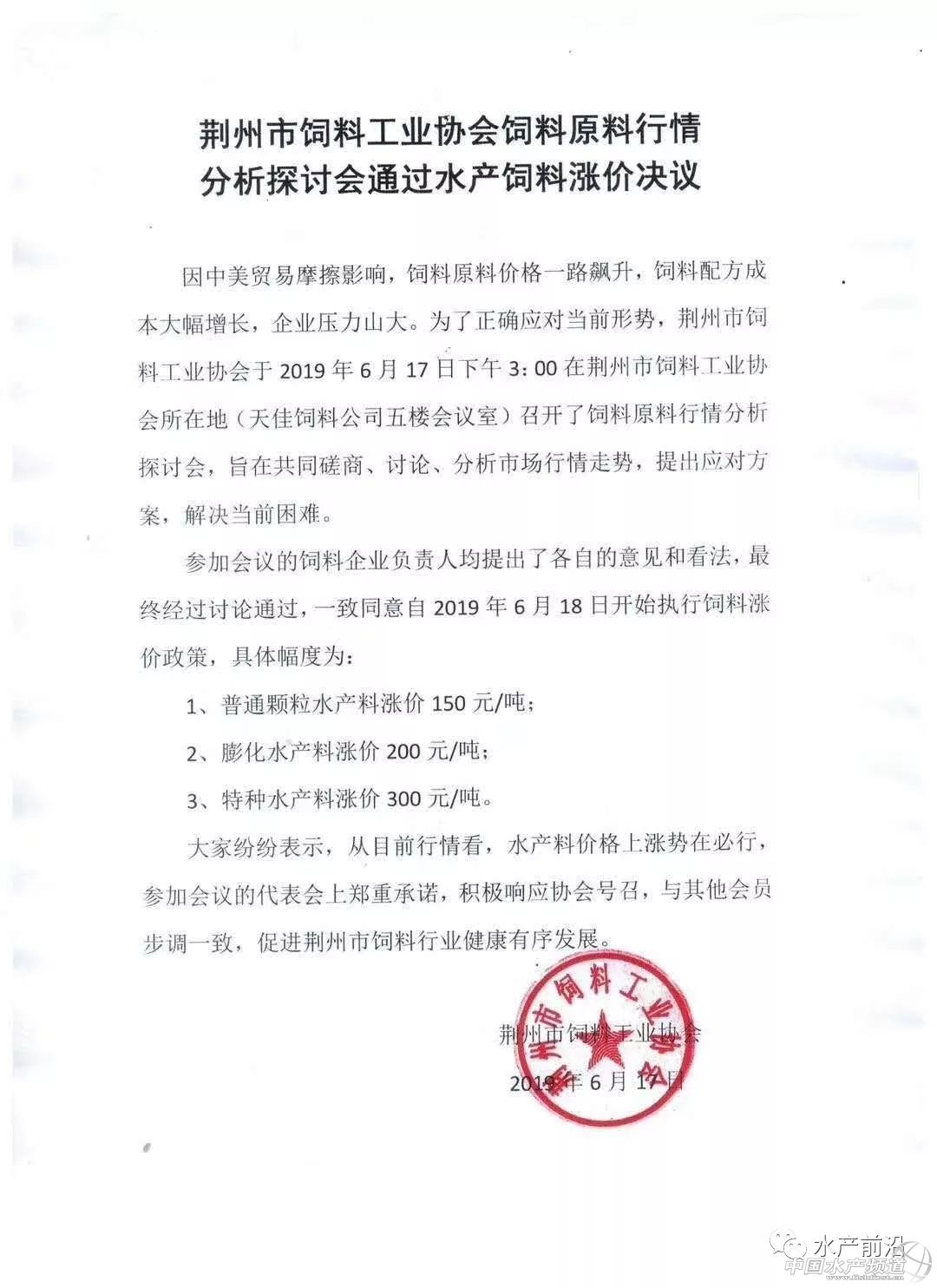 | 中國水產頻道獨家報道, 行情跌宕起伏,豆粕2天內暴跌100元/噸,飼料還漲價嗎? 文/ 中國水產頻道 整理 近來,湖北市場甚是令人關注,原因是這里的水產飼料一波波地漲價! 湖北飼料全線漲價 6月17日,荊州市飼料工業協會發布原料行情分析探討會通過水產飼料漲價決議。決議稱,因中美貿易摩擦影響,飼料原料價格一路飆升,飼料配方成本大幅增長,企業壓力山大。荊州市飼料工業協會于6月17日召開探討會,磋商、討論、分析市場行情走勢,提出應對方案,解決當前困難。參會飼料企業負責人一致同意6月18日開始執行漲價政策:建議具體調價幅度為:1、普通顆粒水產料漲價150元/噸;2、膨化水產料漲價200元/噸;3、特種水產料漲價300元/噸。 而實際上,在荊州市飼料工業協會發布飼料漲價之前,已有不少企業頂不住壓力,上調了飼料價格。 6月7日武漢正大水產宣布漲價:特種魚(包含青蛙料、鲌魚料、泥鰍料、鱸魚料、黃顙料、X0#)價格上調100元/噸。 6月15日武漢大北農宣布漲價:常規顆粒料上漲150元/噸,草魚膨化料、特種膨化料上漲200元/噸。 緊接著,6月18日起荊州市京大飼料有限公司宣布漲價:上漲幅度為:普通顆粒水產料,上調150元/噸;膨化水產料,上調200元/噸;特種水產料,上調300元/噸。 6月18日洪湖海大宣布飼料漲價。6月19日天門海大、天門通威宣布飼料漲價,兩企業的普通顆粒料和普通膨化料上漲的幅度一致,為200-300元/噸。三個公司調價時間均為6月21日零時執行。 另外,漢川恒興表示或者6月22日漲價,武漢澳華預計6月25日漲價。華中粵海劉總暫時不漲。 談判有望再度啟動,國內豆粕應聲暴跌 據悉,近日中美貿易再度啟動談判,業界預測有望達成協議。昨天、今日豆粕主流報價連續高位大幅暴跌回落,累計疊加較6月17日最高點跌了100元/噸。 豆粕價格下跌,對料企生產壓力可起到緩解作用,或者猛烈的漲價勢頭有望得到遏制。 6月29日飼料原料價格表 6月20日飼料原料價格表 附各大料企漲價通知: 天門海大飼料有限公司調價通知 洪湖海大漲價通知 受中美貿易戰影響,從5月開始大宗原料暴漲。為保證產品質量,經公司研究決定,從2019年6月21日零時開始,公司魚種料、混養成魚料上漲100元/噸,草魚膨化料上漲150元/噸,其他專養料上漲150元/噸。 天門通威生物科技有限公司 荊州市京大飼料有限公司 武漢大北農水產科技有限公司漲價通知 武漢正大漲價通知 因原料價格上調,武漢正大水產從6月7日起特種魚(包含青蛙料、鲌魚料、泥鰍料、鱸魚料、黃顙料、X0#)價格上調100元/噸,敬請相互轉告,不便之處,敬請諒解! 荊州市飼料工業協會通過水產飼料漲價決議 |