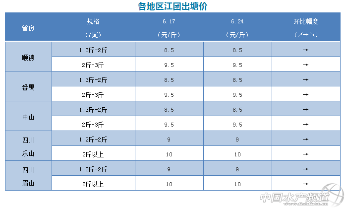 1、廣東江團本周價格與上周繼續保持一樣,小魚還是8.5元/斤,中魚9.5元/斤,超大魚還是7元/斤。目前江團存塘量很少,銷量也不大,能滿足市場需求,價格漲不上去。廣東地區現在持續高溫,廣東地區的魚成活率比四川魚差,所以很多客戶比較喜歡四川本地魚,導致廣東魚銷量不大。