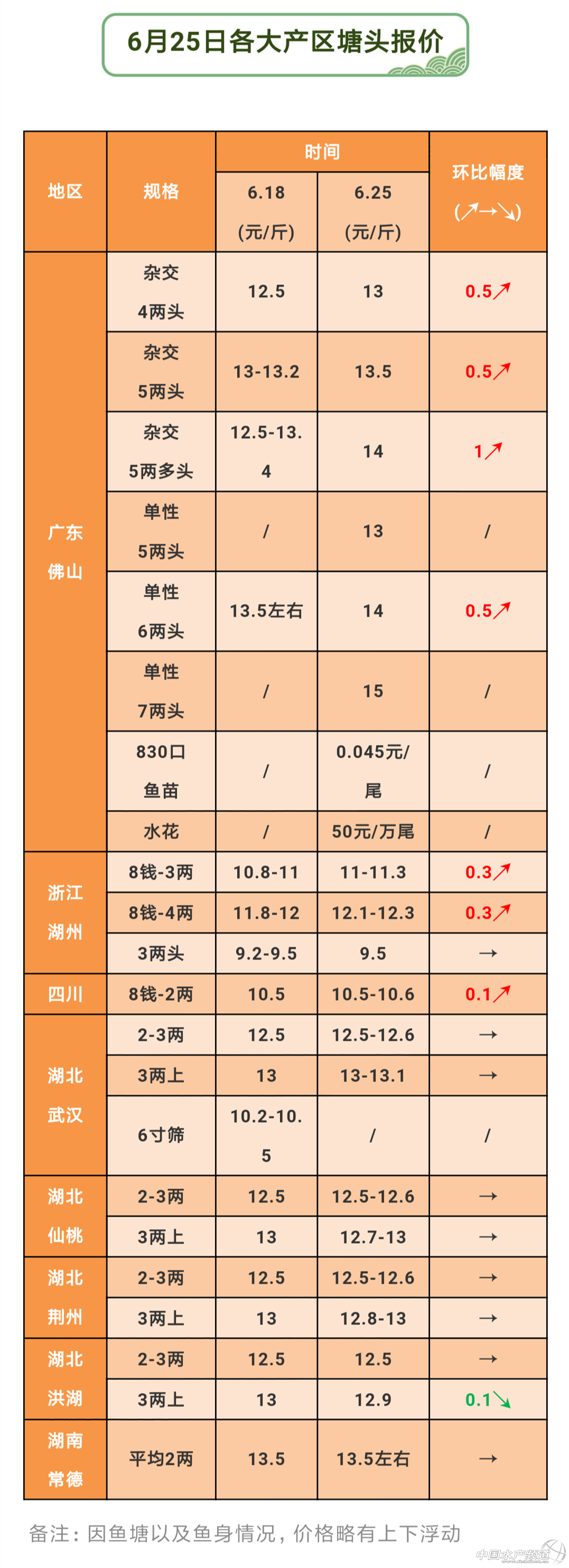 | 中國水產頻道原創報道, 最新報價、熱點行業資訊 黃顙魚行情周報正式發布 每周相約水產前沿 文/ 水產前沿實習編輯 林貞武 近一周,黃顙魚繼續保持著其穩中上漲的趨勢,顯示出明顯的價格優勢,在行情一路大好的環境下,養殖戶出魚的積極性比較高,價格最高達15元/斤,呈現“爬坡式”上漲。 就全國個發產區來看,目前大規格魚已經開始缺貨,存塘量少。相對比上周,廣東4兩上雜交魚頭上漲0.5元/斤,越是大規格的魚,上漲的幅度更大,從這幾組數據局中可以看出兩個點,第一個為市面上大魚開始緊缺,第二個為大魚更加受消費市場的喜愛。單性7兩魚頭塘頭價達到15元/斤,廣東產區走貨量暫時穩定,后市行情預測穩中有漲。相對而言,目前魚苗行情一般。浙江地區在經歷兩周的穩定期之后,終于在本周價格微微上漲,其實分析到底就是市場需求量的關系,隨著天氣上升,運輸成本增加,當地抓魚變多,行情上漲。四川產區和湖北產區本周暫時保持穩定的狀態,外地拉魚車不多,走貨量保持穩定,預計隨著規格魚的減少價格會有上漲。 面對目前行情,有幾下幾個忠實讀者私信小編發表了自己的想法: 養魚達人:“魚類價格是否漲價主要看市場需求,品種好養殖面積少的魚類肯定會繼續漲,就像我看好的這個黃骨魚后期行情應該是不會差的” 毛記水產:“高溫運輸造成運輸成本變高,伏季休漁期,勢必會拉動魚價,最近又是這種惡劣天氣,動不動就下暴雨,一不小心就應激缺氧,真不省心” 魚老板:“從去年養到現在,當時的價格都不想養了,辛虧堅持下來,不然有得后悔,養魚人干著累活不怕,最怕辛辛苦苦一年多還虧錢” 新魚民:“養呢個黃骨魚最怕就是水質不好就加換水,加水之后就長蟲,長蟲之后用甲醛殺蟲又壞水,水差又換水,反反復復,去年真實搞死我了,得虧找到方法。 其實就小編來說,養魚除了憑借自己的經驗,也要結合一些新的技術和方法,畢竟現在的水質沒以前好了,疾病也越來越多,按照經驗有時候是很難搞的,不斷學習,努力創收!” |
