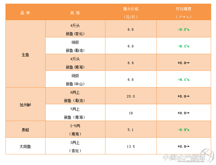 | 中國水產(chǎn)頻道原創(chuàng)報道, 文/ 珠海海龍、水產(chǎn)前沿 吳佳輝 淡水特種魚:生魚本周價格維持穩(wěn)定,存塘較大 生魚 順德杏壇:新魚4斤頭左右統(tǒng)級6.7-7.2元。分級2斤上7.5-7.7元,2斤下6.0-6.2元。本周價格維持穩(wěn)定,之前魚中手中已經(jīng)定下不少魚,目前正在消化。高溫季節(jié)到來,加上行情利好,魚塘投喂積極性高漲,隨之而來發(fā)病情況增加內(nèi)服保健與水質(zhì)管理工不可掉以輕心。 勒流區(qū)域:近期養(yǎng)戶惜售,市場走量降低,高溫出魚,上車運輸損耗較多,魚中發(fā)價略降。目前市場存塘依舊較大,高溫魚塘損耗較多,對于后市走勢需謹慎看待。目前生魚舊魚塘改底模式,以底倍健少量多次反復改底再3201解毒比較好。 南海西樵九江:本周魚價有輕微波動,6-7成大魚6.8-7.0元上下浮動,整體上沒有太大升降,市場對魚身材還是有較高要求,尾批苗放苗有所增加,市場價格為穩(wěn)。 中山區(qū)域:生魚價格小幅下跌,2斤上7.5-7.7元,2斤下6-6.2元,2斤上7成左右6.8-7元,市場走量保持穩(wěn)定;高溫季節(jié)來臨且天氣不穩(wěn)定,病害損耗常見,建議養(yǎng)殖戶做足預防措施。 |