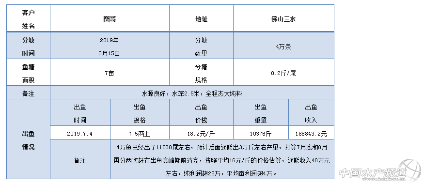 文/圖 水產前沿 Perch & Bass 中國水產頻道原創獨家報道,從養殖新手到養殖高手,他僅用了一年的時間,便詮釋了非主產區加州鱸養殖戶完全可以后來居上。 吳志圖(以下簡稱“圖哥”)養的加州鱸新魚昨天上市了,4萬魚7.5兩上出了10376.5斤,這是2019年三水出的第一塘新魚,看到抓起來的加州鱸像他自己一樣肉厚肥身,他開心地笑了。 圖哥 圖哥是佛山三水人,2004年開始從事養殖,像三水很多養殖戶一樣,他在塘邊養殖豬、鴨,并用豬糞和鴨糞配套養殖鯪魚和四大家魚,養殖效益一直不算太好,賺不到什么錢。2017年底廣東大面積禁養畜禽,2018年開始,圖哥開始尋找新的養殖方向,并最終將目標鎖定在近幾年養殖火爆且銷量較大的加州鱸身上。 2018年3月2日,圖哥開啟了自己的加州鱸養殖之路。那是他第一次養加州鱸,也走了不少的彎路。他在一個9畝的魚塘放了3.2萬290口的苗,水深只有1.5米,養到2018年9月1號才出頭批魚,后來因為發病加上第二批和第三批趕上出魚高峰,行情低迷,整體來說,第一年的養殖在保本的基礎上略有小小盈利。 經過了第一年的養殖之后,圖哥有了經驗,將魚塘水深提高到2.5米。2018年12月4號,他買了6萬尾規格一斤230條的加州鱸苗放進一個4畝的魚塘,并搭了溫棚。2019年3月15日過塘,他過了4萬尾規格0.2斤/尾的苗進一個7畝的塘,還有1.5萬尾留在原塘。該7畝的塘7月4號出頭批魚,抓7.5兩上規格,共出了10376斤魚,18.2元/斤,上車平均規格9.5兩,頭批7.5兩上出魚率超25%。 圖哥的魚塘塘租是2000元/畝,全程吃杰大加州鱸飼料,今天出魚已經讓他收回了六成以上的養殖成本,4萬魚已經出了11000尾左右,預計后面還能出3萬斤左右產量,打算7月底和8月再分兩次趕在出魚高峰期前清完,按照平均16元/斤的價格估算,預計還能收入48萬元左右,純利潤超28萬,平均畝利潤超4萬。 “今天出魚效果很滿意,規格很均勻,而且魚體肉厚肥身,像我一樣。”圖哥開心地說,“看到今天的出魚效果,估計周邊會有更多的養殖戶加入進來養殖加州鱸”。 實際上,避開主產區出魚高峰,早投苗早清塘的模式早在多年前已經在江門荷塘、棠下一帶形成主流,并取得了十分可觀的養殖效益。就在不到一周前的6月27日,江門棠下養殖戶吳老板出了頭批魚,同樣全程使用杰大加州鱸飼料,2018年11月6號放苗208口斤,養殖面積5畝,定塘3萬尾,用料共807包,6兩以上共出魚19683斤,比例超過6成,平均上車1.05斤,魚頭2.2斤。原本6月初就已經夠規格可以出魚,但一直想再等下魚價還能不能再升,所以一直推到月底才出魚,現場看起來規格不是舊魚勝過舊魚,預計后面出魚利潤將十分可觀。 江門吳老板出魚盛況 吳老板出的新魚魚頭2.2斤 吳老板養的新魚肉厚長身 成魚肝臟鮮紅,非常健康 “非主產區價格一直比主產區低0.3-0.5元/斤,主要是跟養殖量小有關。目前肇慶四會、沙埔一帶已形成一定的加州鱸養殖規模,當地養殖戶也比較容易接受新事物。相對而言,三水地區加州鱸養殖比較零散,很多養殖戶處于觀望狀態,未形成規模,賣魚、看魚病等各項養殖配套也相對還不成熟,但該區域地理優勢明顯,塘租不高,未來加州鱸的發展空間會很大。”杰大三水區域經理歐慶豐說到。 右一:杰大區域經理歐慶豐 三水是廣東地區傳統的四大家魚養殖中心之一,長期以來都是以豬、鴨、魚的立體養殖模式為主,隨著畜禽大面積禁養,這種模式已不可持續。常規的四大家魚價格長期低迷,利潤微薄,如何選擇新的養殖品種提高養殖效益成為養殖戶面臨的一道難題。 “當前養殖端和消費端的形勢已經發生了顯著的變化,連續多年的網箱拆除、湖泊水庫禁養導致四大家魚養殖量減少,價格卻未見起色。另一方面,加州鱸、鱖魚等特種魚卻持續火爆。消費端以90后、00后為代表的方便、快捷的飲食文化,深加工品種逐漸被消費者接受,另外收入提高也帶來了消費品種升級。養殖戶也應該關注到這種變化而逐步升級到特種養殖。”長期從事飼料配方和養殖技術研究的杰大技術總監汪福保給出了他的看法,“從目前的幾大特種魚品種來看,加州鱸會是第一選擇,從養殖難度、價格穩定性、資金投入、銷路通暢性等幾個方面來說,都會比鱖魚、生魚、黃顙魚更有優勢,養殖模式方面,這兩個案例可以提供一個很好的參考,總的原則是早放苗、密度適中(5000尾/畝左右)、早出魚、早清塘,從而獲得較好的效益。這中間飼料會是一個比較關鍵的因素,首先需要考慮的是生長速度(趕頭批)、其次要兼顧健康、體型和飼料成本,通過定期打樣對比可以比較清楚地判斷飼料品質好壞。” 【關鍵字】:加州鱸 加州鱸養殖 水產養殖 |