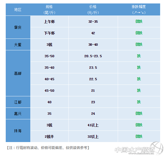 | 中國水產頻道原創報道, 白蝦價格開始回升,羅蝦、斑節價格或將回暖 文/ 水產前沿 何鴻浩 本周行情 1、白蝦價格開始回溫,羅蝦、斑節蝦或搭其順風車 白蝦是所有蝦品類中的風向標,近來2個月半內,白蝦價格持續低迷。而上周周末,終于傳來上漲信息,蕭山、如東、鹽城、連云港等地都開始上漲。對此,有業內人士表示羅蝦、斑節蝦還是有望搭上漲價順風車。 2、大規格蝦抗風險能力強 本周斑節、羅蝦價格出現波動,即便是大規格蝦也受到了一定影響,出現略微掉價的情況。但值得注意的是,大規格羅蝦、斑節蝦的掉價幅度較小,小規格蝦跌價幅度較大(對比上周,漳浦斑節跌6元/斤,高郵羅蝦跌4元/斤)。顯然,大規格蝦抗風險能力較強,在整體行情不佳的情況下仍保持較為穩定的市場價格。 3、集中上市在即,價格可能起勢不明顯 各地市場即將進入上市高峰期,供應量將明顯提高。一般而言,市場上倘若沒有較為明顯的消費拉動,市場價格增長將放緩甚至下跌。因此,選擇選擇一個合適的時機賣蝦將會是增加收益的一大方法。 7月8日羅氏沼蝦 羅氏沼蝦(供圖:珠海容川 莫華文) 今日羅蝦抓蝦視頻(拍攝:珠海蝦中華哥) 7月8日斑節對蝦 斑節對蝦(供圖:海南高大尚 彭正德) 近期斑節對蝦抓蝦視頻(拍攝:北海蝦中符哥) 日本對蝦、東方蝦 日本對蝦、東方蝦各區域未有流通信息,請各位讀者靜待佳音。 提起蝦,人數總是最先想起南美白對蝦(凡納濱對蝦)。但事實上,我們可以選擇養殖或食用的蝦還有很多,例如素有淡水蝦王之稱的羅氏沼蝦(羅蝦、沼蝦)、肉質緊繃口感爽的斑節對蝦(草蝦、金剛蝦)、味道鮮美的日本對蝦(花蝦、車蝦)、海味十足的中國明對蝦(東方蝦)等。 |