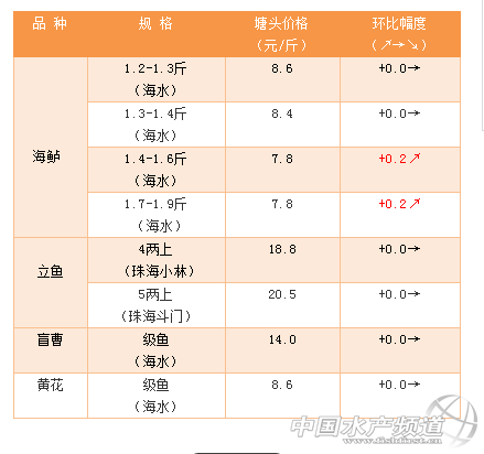 中國水產頻道原創報道, 文/ 珠海海龍 水產前沿 吳佳輝 海水特種魚:海鱸級魚需求大,后市看漲鱸魚 本周鱸魚中大魚級別有所回升,級魚需求較大,后市看好級魚價格上漲。 立魚 珠海小林:市場出魚量增加,存塘量大,客戶想快速出魚干塘,上市以大規格立魚為主(5兩上)。市場病害較多,客戶恐慌性出魚,預計后市魚價下跌。 珠海斗門:行情穩定。 盲曹:雖然近期多頭箍出魚,但是依舊缺魚,價格保持穩定。 黃花:級魚8.6元,中大魚成數越高價格隨之下降,雖今年放苗少,但珠三角地區受鱸魚存塘多沖擊,價格趨于穩定。 【關鍵字】:海水魚 價格行情 水產養殖 |