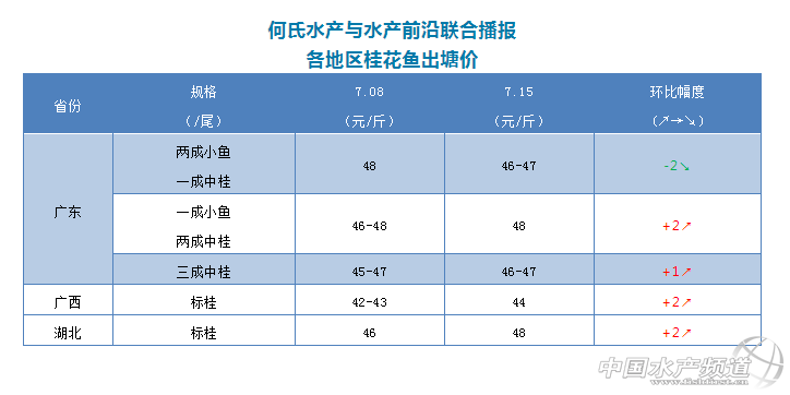 | 中國水產頻道原創報道, 文/圖 何氏水產、水產前沿 李靜 桂花魚 1、本周廣東桂魚價格丁、小魚價格下跌了2元/斤左右,中魚價格上漲了2元/斤。目前最好規格的魚(2成中桂,1成小魚)價格上漲到48元/斤左右,偏大點的魚價格最高漲到46-47元/斤左右,偏小點的魚下跌了3元/斤,達到46-47元/斤。實際成交價格還要看魚的規格比例來定。目前丁、小魚跌價的主要原因是存塘老魚基本沒有,新魚馬上上市,新魚以偏小魚為主,但市場上偏小的魚賣不動。現在流通商嚴重虧損,市場爛市,市場批發價提不上去,塘頭價格降不下來。后期隨著新魚上市,桂魚價格或許還會持續下跌。 2、上周湖北、廣西地區標桂價格上漲2元/斤,銷量也跟上周差不多。江蘇、安徽老魚已經結束,新魚以小魚病魚為主,價格很便宜。 |