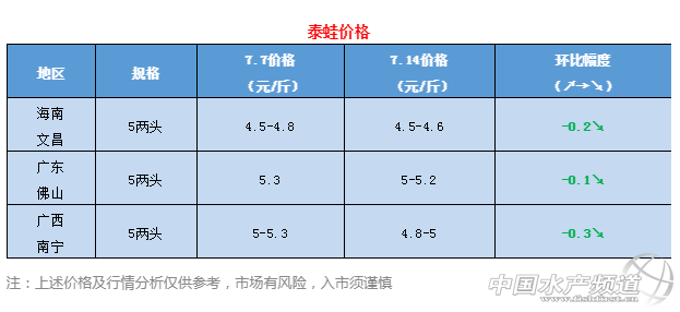 | 中國水產頻道原創報道, 7月14日最新蛙價行情周報 文/水產前沿 陳曉慶 一周行情簡析 牛蛙 本周的牛蛙價格仍舊漲跌不定,前幾天牛蛙價格持續上漲,最高達到了8元/斤,而到了周末又出現了下滑的趨勢。 廣東地區:澄海目前沒有大蛙,牛蛙收購價格在7.6元/斤左右。江門7兩頭牛蛙今日價格7.5-7.8元/斤,與上周持平。廣州附近地區的新蛙預計在八月份會有少量上市,而澄海地區的牛蛙預計要到農歷十月份左右才能上市。 福建地區:福建福州今日牛蛙現金價7.3元/斤,欠賬7.8元/斤,與上周相比下降了0.2元/斤;漳平今日現金價7.3元/斤,廠家收購價8元/斤,明日收購價將下降0.5元/斤;廈門地區明日牛蛙現金價6.8元 /斤,漳州明日報價6.9-7元/斤。目前福建地區主要受拆遷、暴雨天氣影響集中出蛙,價格有所下滑。 江西地區:江西地區今日報價6.8元/斤,與上周相比下降了0.8元/斤。近期江西地區受強降雨、雷暴大風等強對流天氣影響,水位上漲,江西廣昌、萬安等地的禁養行動也正在開展,雙重壓力下,養殖戶也不得不出蛙。 視頻:昨日江西永州地區受河水倒灌影響,青蛙泥鰍等養殖池塘被河水淹沒,附近多處養殖戶受到了不同程度的損失。 海南地區:本周海南地區7兩頭牛蛙價格7.5元/斤,與上周持平。 廣西地區:本周廣西南寧7兩頭牛蛙價格7.5元/斤,與上周持平。 青蛙(黑斑蛙) 目前各個地區的新蛙已經陸陸續續上市。江西地區今日青蛙批發價格20元/斤,出貨價18-19元/斤。目前江西地區的黑斑蛙新蛙規格還比較小,養殖戶多是挑大蛙去賣,出塘量不多,但消費市場需求量依然很高。 泰國虎紋蛙 本周泰蛙價格微跌,廣西、廣東、海南等地的價格相比上周下降了0.1-0.3元/斤。 |