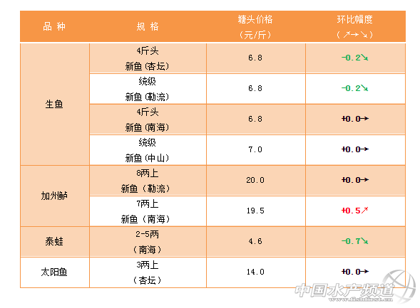 | 中國水產頻道原創報道, 文/ 珠海海龍、水產前沿 吳佳輝 淡水特種魚:生魚存塘量大,價格輕微下滑 生魚 順德杏壇:6成左右統級6.6-6.7元,7成左右統級6.8-7.1元。受高溫天氣影響,開網捉魚和運輸流通的損耗較大,魚中與流通商為平衡利潤發價會偏低,造成魚價輕微下行。 勒流區域:魚價反復波動,各種因素導致魚價難以大漲,存塘魚量比較大,未來魚價估計平穩波動,建議根據自身生產計劃做好決定是否出魚。近期高溫天氣,出魚損耗大,建議停料前一兩天開始硝勝克降亞鹽處理,停料后連續應激靈抗應激兩次。 南海西樵:九江本周價格趨于穩定,沒有太大的波動,魚塘發價視魚成數、大小等情況有一定差異,在6.6-7.0元不等,生魚尾批苗投苗積極性稍有增加,舊魚存塘相對還是較多。 中山區域:本周生魚價格保持穩定,2斤上7.5-7.7元,2斤下6-6.2元,統貨6.8-7.1元;高溫季節,出魚損耗較大,建議養殖戶出魚前做足預防處理。 |