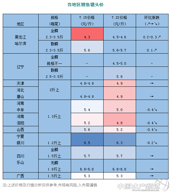 | 中國水產頻道原創報道, 新魚大量上市后可能還會跌價 文/ 水產前沿 葉豐齊 本周,各地區鯉魚行情一覽。 東北地區:黑龍江哈爾濱2.5斤以上規格全鱗鯉魚4.5-4.6元/斤,環比上周上漲0.2-0.3元/斤,老魚4.7元/斤;同規格的散鱗鯉魚約5.6-5.7元/斤,環比上周上漲0.1元/斤;遼寧全鱗鯉魚出的新魚規格不一,價格在4.5-5元/斤之間浮動;散鱗鏡鯉2.5-3.5斤規格的約5.8元/斤。 河北唐山和天津地區:新魚走量上市,2斤以上規格約4.9元/斤,與上周持平;2.3斤規格的5元/斤。 河南地區:新魚還未上市,但入伏后消費減少;1.3斤以上規格鯉魚,鄭州中牟5元/斤、洛陽4.8元/斤,環比上周都下跌了0.4元/斤。按目前情況,新魚大量上市后可能還會跌價。 山西地區:1.3斤以上規格5.2元/斤,環比上周下跌0.4元/斤。寧夏銀川1.2斤以上規格鯉魚6.3元/斤,環比上周下跌0.2元/斤。 四川地區:目前養戶在陸續出老魚。1.5-2斤以上規格全鱗鯉魚5.7元/斤,1.8-2斤規格的無鱗鯉魚6.6-6.8元/斤,保持上周行情。 廣西地區:老魚存塘慢出,價格平穩;鯉魚1.5斤以上規格約5.3元/斤,1.3斤左右的約5.2元/斤,和上周一致。 |
