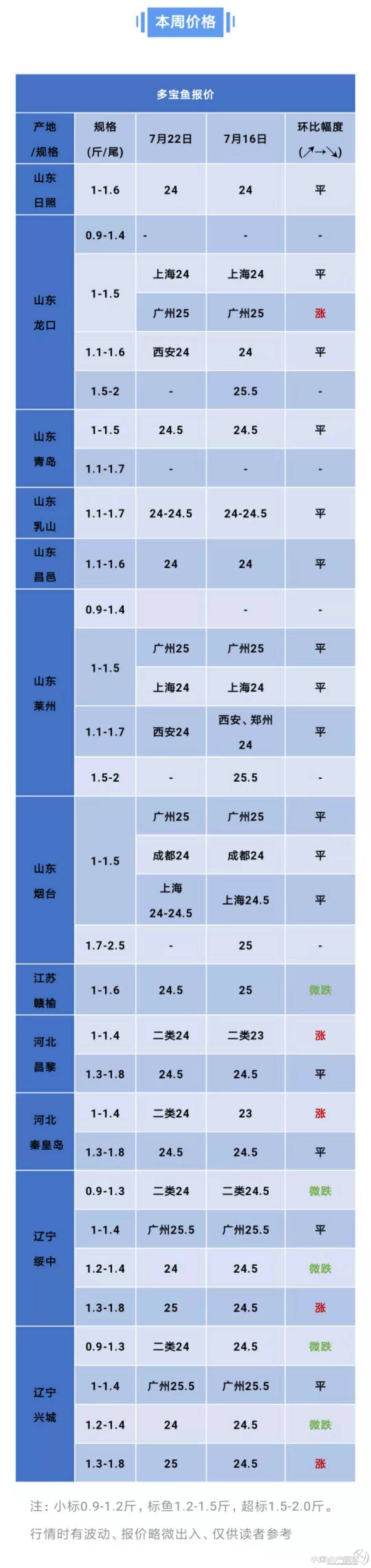 | 中國水產(chǎn)頻道原創(chuàng)報道, 本周行情 上周多寶魚幾乎全線上漲,而且最高漲幅達(dá)到1.5元/斤,讓業(yè)界看到一線希望。本周,多寶魚價格波動不大,多地魚價維穩(wěn)。但是河北、遼寧地區(qū)個別規(guī)格魚依舊有“漲”聲,漲幅0.5元/斤,同樣是遼寧地區(qū)小規(guī)格的魚行情有波動,微跌0.5元左右。 養(yǎng)殖戶反映高溫天氣到來,多寶魚養(yǎng)殖難度也會加大,現(xiàn)在都沒有大魚了,一般到了標(biāo)魚規(guī)格就可以賣了,不然風(fēng)險就會增加。流通商表示由于天氣熱起來了,養(yǎng)殖戶出魚挺積極的,目前暫時供需平衡,魚價還會保持平穩(wěn)。但隨著存魚量減少,業(yè)內(nèi)人士表示大魚緊缺,8月還有漲價的空間,建議養(yǎng)殖戶要理性看待行情,做好出魚規(guī)劃,讓多寶魚行業(yè)良性發(fā)展! 希望所有的多寶魚養(yǎng)殖戶加強(qiáng)溝通,讓信息更通暢一些,每個人都能賣出高價,好價! |
