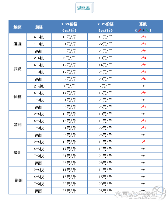 | 中國水產頻道原創報道, 小龍蝦上市正當時 全國小龍蝦行情解析 水產前沿與您每周相約 文/ 水產前沿 鄭鵬飛 最近各地氣溫明顯升高,洪澤湖在持續高溫少雨的天氣影響下水位嚴重下降,周邊的10萬多畝圍網養殖出現大面積死魚,損失達數億元。目前周邊大面積魚、蝦、蟹塘正處于缺水狀態,很多養殖戶只能靠井水救急。 最近半個月以來,湖北武漢地區的氣溫一路攀升,目前白天最高氣溫達到了37℃。隨著氣溫的升高,蝦塘里的小龍蝦開始打洞以躲避高溫,后期小龍蝦的捕撈難度也會更加困難。小龍蝦的價格行情在經歷了前幾天的暴跌之后,今天多個地區批發價出現反彈。目前湖北武漢1兩以上的小龍蝦批發價已經回到28元/斤,洪湖、仙桃、監利等多個地區價格也都出現了上漲。 |