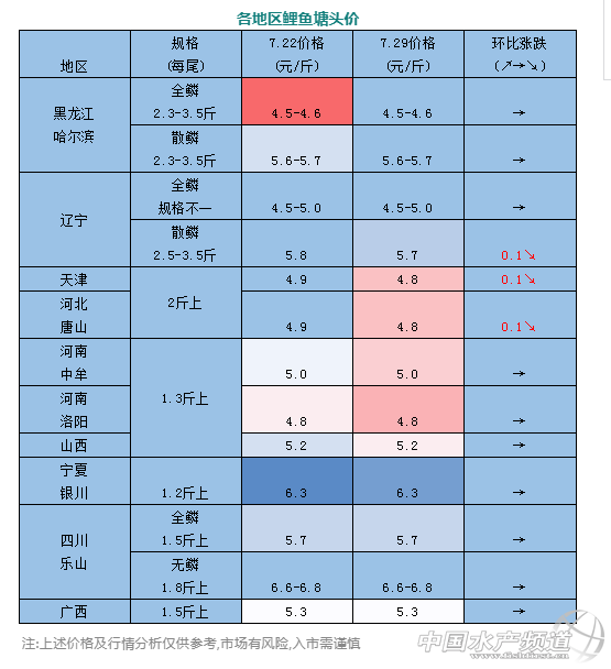 | 中國水產頻道原創報道, 需求減少,魚價不佳,養戶惜售 文/ 水產前沿 葉豐齊 本周,各地區鯉魚行情一覽。 東北地區:黑龍江哈爾濱目前出魚較為緩慢,因市場需求減少,價格上不去,令部分養戶惜售;2.5斤以上規格全鱗鯉魚4.5-4.6元/斤,老魚4.7元/斤,同上周。同規格的散鱗鯉魚約5.6-5.7元/斤,維持上周價格;遼寧全鱗鯉魚出的新魚規格不一,價格在4.5-5元/斤之間浮動;2.5-3.5斤規格的散鱗鏡鯉約5.7元/斤,環比上周下跌0.1元/斤。 河北唐山和天津地區:新魚走量上市,2斤以上1齡鯉魚約4.8元/斤,環比上周下跌0.1元/斤;2齡老魚5.3元/斤。 河南地區:入伏拉魚車少,走量緩慢;1.3斤以上規格鯉魚,鄭州中牟5元/斤、洛陽4.8元/斤,保持上周行情。 山西地區:1.3斤以上規格5.2元/斤;寧夏銀川1.2斤以上規格鯉魚6.3元/斤,同上周。 四川地區:老魚陸續出魚,1.5-2斤以上規格全鱗鯉魚5.7元/斤,1.8-2斤規格的無鱗鯉魚6.6-6.8元/斤,保持上周行情。 廣西地區:1.5斤以上規格老魚約5.3元/斤,1.3斤左右的約5.2元/斤,和上周一致。 |