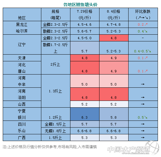 | 中國水產頻道原創報道, 新魚小,老魚少,走量緩慢 文/ 水產前沿 葉豐齊 本周,各地區鯉魚行情一覽。 東北地區:黑龍江哈爾濱2.3-2.5斤以上規格全鱗鯉魚4.7-4.8元/斤,環比上周上漲0.2元/斤;同規格的散鱗鯉魚約5.2-5.3元/斤,環比上周下跌0.4元/斤;遼寧目前老魚少,新魚還不夠大,全鱗鯉魚2.3-2.5斤規格約4.8元/斤;1.7-2.5斤規格散鱗鏡鯉5.2-5.3元/斤,環比上周下跌0.4-0.5元/斤;凡是不夠2.5斤的鏡鯉僅5.2元/斤,2.5斤及以上規格約5.3元/斤。 河北唐山和天津地區:2斤以上1齡鯉魚約4.9元/斤,環比上周上漲0.1元/斤;2齡老魚5.3元/斤,和上周一致。 河南地區:1.3斤以上規格鯉魚,鄭州中牟5元/斤、洛陽4.8元/斤,保持上周行情;有業者認為,出魚量緩慢可能造成價格下滑。 山西地區:1.3斤以上規格鯉魚5.2元/斤,同上周;寧夏銀川新魚已上市,1.2斤以上規格5.8元/斤;少量存塘老魚維持上周6.3元/斤的價格。 四川地區:魚價保持上周行情,全鱗鯉魚1.5-2斤以上規格老魚5.7元/斤;無鱗鯉魚1.8-2斤規格的6.6-6.8元/斤。 廣西地區:老魚存塘已經不多,1.5斤以上規格約5.3元/斤,和上周一致。 |