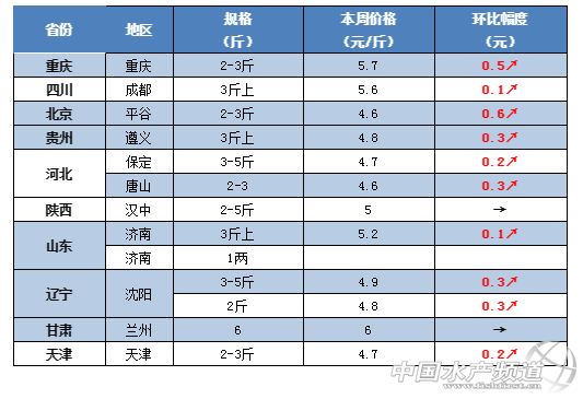 | 中國水產(chǎn)頻道原創(chuàng)報(bào)道, 市場開始缺魚,買魚全靠搶!從搶豬到搶魚,從搶鱖魚、鱸魚到搶草魚、鯽魚,從市場搶到塘頭,20多輛車排隊(duì)搶魚 文/ 水產(chǎn)前沿 鄭鵬飛 一周要聞 近期多個(gè)地區(qū)受到非洲豬瘟的影響,大批生豬被埋,豬肉流通也是受到明顯限制。同時(shí),豬肉價(jià)格的暴漲加上對豬瘟的擔(dān)心使得目前豬肉的消費(fèi)明顯減少。近期水產(chǎn)品大受歡迎,市場多次出現(xiàn)搶魚現(xiàn)象,佛山的鱸魚塘一度出現(xiàn)25輛車塘頭排隊(duì),為搶鱖魚有人還大打出手,目前連草魚和鯽魚也要搶了。 豬瘟導(dǎo)致“搶豬”、“搶魚”現(xiàn)象頻發(fā) 在豬瘟的影響下,最近華南地區(qū)的淡水魚行情火爆。鱖魚最高賣到60元/斤,加州鱸賣到23元/斤,鯽魚也賣到9.5元/斤(江西、江蘇等地最高賣到12元/斤),草魚行情也是開始有所好轉(zhuǎn)。前幾天江門地區(qū)1斤的草魚3.5元/斤沒人要,但是今天早上已經(jīng)可以賣到4.5元/斤了,暴漲了1元/斤;梅州部分地區(qū)2-3.5斤的草魚塘頭價(jià)賣到5.4-5.5元/斤,上漲0.2-0.3元/斤;最近黃圃地區(qū)草魚苗種流通明顯加快,已經(jīng)有客戶開始找1-3兩新苗,目前1-3兩的草魚苗塘頭賣4.5元/斤,2-5兩的賣3.8元/斤,3-7兩的賣3.6元/斤,上漲0.2-0.3元/斤;本周湖南地區(qū)草魚價(jià)格有較明顯的回暖,這兩天常德地區(qū)草魚漲了0.3元,2斤左右草魚塘頭價(jià)4.4元/斤,3斤以上的塘頭賣4.8-5元/斤;衡陽和永州地區(qū)草魚最新報(bào)價(jià)5.8元/斤,上漲0.3-0.5元/斤;岳陽地區(qū)草魚賣4.4-4.6元/斤。據(jù)養(yǎng)殖戶介紹,目前四川內(nèi)江地區(qū)草魚和鯽魚價(jià)格都漲了;成都地區(qū)的草魚也是再次上漲,3斤的草魚可以賣到5.6-5.7元/斤;廣元地區(qū)3-5斤的塘頭賣6.8元/斤;德陽地區(qū)草魚也已經(jīng)漲到5.6元/斤,較之前上漲0.3元/斤,鯽魚賣6.5元/斤,大鯽魚能賣到7元/斤;南充地區(qū)3斤多的草魚已經(jīng)賣到6.2元/斤;重慶地區(qū)小草魚批發(fā)價(jià)也賣到了6元/斤。目前河北唐山地區(qū)3斤左右的草魚最新塘頭價(jià)4.5-4.8元/斤,最高可以賣到5元/斤。目前遼寧沈陽地區(qū)什么魚都漲了,草魚最新塘頭價(jià)賣到4.8-4.9元/斤,上漲了0.2-0.4元/斤,全鱗和鯽魚的價(jià)格上漲更為明顯。 有養(yǎng)殖戶表示,今年魚價(jià)行情有望迎來歷史新高。淡水魚的春天真的要來了?對于接下來的行情您怎么看,歡迎留言分享! 一周行情 華南地區(qū) 最近華南地區(qū)的淡水魚行情火爆,一度出現(xiàn)25輛魚車塘頭搶魚,甚至有人為搶魚而大打出手,鱖魚最高賣到60元/斤,加州鱸賣到23元/斤,鯽魚也賣到12元/斤。據(jù)了解,目前華南的草魚行情也是開始有所好轉(zhuǎn),草魚的流通較之前有明顯加快。從養(yǎng)殖戶了解到,前段時(shí)間江門地區(qū)1斤的草魚3.5元/斤沒人要,而今天早上已經(jīng)可以賣到4.5元/斤了;目前梅州部分地區(qū)2-3.5斤的草魚塘頭價(jià)賣到5.4-5.5元/斤,上漲0.2-0.3元/斤;珠海的超市鯇塘頭價(jià)賣4.2元/斤,4-5斤賣4.7元/斤,存塘草魚已經(jīng)不多,后市有望進(jìn)一步上漲;受成魚上漲拉動,最近黃圃地區(qū)草魚苗種流通明顯加快,已經(jīng)有客戶開始找1-3兩新苗,目前1-3兩的草魚苗塘頭賣4.5元/斤,2-5兩的賣3.8元/斤,3-7兩的賣3.6元/斤;最近東升的脆肉鯇已經(jīng)開始試脆,隨著脆肉鯇的上市有望拉動大草魚行情回暖。 江門:本周江門地區(qū)草魚行情總算開始出現(xiàn)上漲勢頭。從養(yǎng)殖戶了解到,今天早上剛賣的1斤的草魚塘頭價(jià)4.5元/斤,相比之前3.5元/斤都沒人要,目前的行情已經(jīng)有所好轉(zhuǎn)。 梅州:有業(yè)內(nèi)人士反映,如果草魚價(jià)格再不漲好多養(yǎng)殖戶都要棄養(yǎng)了,而最近梅州地區(qū)的草魚總算是漲了一點(diǎn)。目前,有少部分地區(qū)2-3.5斤的草魚已經(jīng)從之前的5.2元/斤漲到最高5.4-5.5元/斤,上漲0.2-0.3元/斤。 中山:最近黃圃地區(qū)草魚苗種流通較之前有明顯加快,目前2-5兩的苗種不多,已經(jīng)有客戶開始找1-3兩的新苗。目前黃圃1-3兩的草魚苗塘頭賣4.5元/斤,2-5兩的賣3.8元/斤,3-7兩的賣3.6元/斤,較之前上漲了0.2-0.3元/斤,流通商表示最近魚的流通就順暢了很多。據(jù)了解,目前東升的脆肉鯇已經(jīng)開始試脆,隨著脆肉鯇的上市有望能夠拉動大草魚行情回暖。 佛山:本周佛山地區(qū)的草魚還是繼續(xù)保持穩(wěn)定,暫時(shí)沒有出現(xiàn)上漲。有養(yǎng)殖戶表示,明天凌晨12點(diǎn)會刮魚賣,5斤以上的草魚塘頭賣5.1元/斤,沒有大頭和鯽魚還不要,半夜賣魚還這么便宜,跟偷回來賣一樣,真是要被氣死。 廣州:目前廣州地區(qū)的草魚塘頭價(jià)基本維持上周水平,從流通商了解到目前3斤的草魚塘頭收購價(jià)還是只有4.1元/斤左右。 廣西:本周廣西地區(qū)的草魚價(jià)格暫時(shí)沒有出現(xiàn)好轉(zhuǎn)。目前桂林、貴港地區(qū)2-4斤的草魚最新報(bào)價(jià)還是維持在5.2元/斤,養(yǎng)殖戶表示現(xiàn)在草魚太高產(chǎn),魚還是太多了。 華中地區(qū) 本周華中地區(qū)草魚行情穩(wěn)重有升,其中湖南地區(qū)草魚價(jià)格有較明顯的回暖。這兩天常德地區(qū)草魚漲了3毛錢,2斤左右草魚塘口價(jià)格4.4元/斤,3斤以上的塘口賣4.8-5元/斤;衡陽和永州地區(qū)草魚最新報(bào)價(jià)5.8元/斤,上漲0.3-0.5元/斤;岳陽地區(qū)草魚賣4.4-4.6元/斤,預(yù)計(jì)
