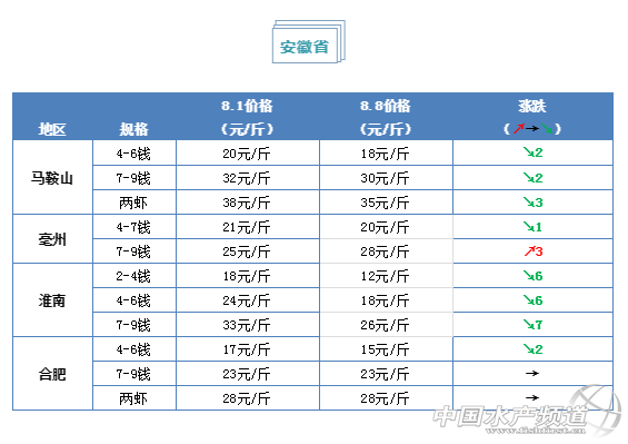 | 中國水產頻道原創報道, 小龍蝦上市正當時 全國小龍蝦行情解析 水產前沿與您每周相約 文/ 水產前沿 鄭鵬飛 養殖戶已開始搶苗 7月的最后一個星期內小龍蝦行情出現了一波大漲,突然暴漲的行情讓消費市場受到很大影響。有流通商表示,高溫導致小龍蝦打洞難以捕撈,目前收蝦很難,但是漲價也導致買蝦的也減少了很多。據了解,近期全國各地小龍蝦的批發價格出現了一波明顯回落。其中,北京、上海和廣州幾個主要消費城市價格下跌最為明顯,上海2-4錢的蝦從之前的15元/斤跌回到9元/斤,下跌6元/斤;云南、安徽、河南和湖南多個地區也是下滑比較明顯,安徽淮南地區7-9錢的蝦最新報價26元/斤,相比上周最高下跌了7元/斤,其他規格也有2-3元/斤的下滑。 不過接下來蝦會越來越少,小龍蝦的大行情還是有望繼續保持上漲趨勢。目前湖北、浙江、江西以及四川等地區的小龍蝦批發價相比上周仍有比較明顯的上漲,其中山東濟寧地區7-9錢的下龍蝦最高上漲6元/斤,最新報價27元/斤;四川成都地區7錢以上的最高賣到33元/斤,上漲6元/斤;湖北潛江地區兩蝦已經賣到42元/斤,上漲3元/斤。 |