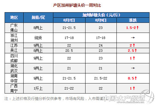 中國水產頻道原創報道, 養好魚,更要賣好魚! 加州鱸行情周報 《鱖鱸前沿》與您相約每周五 文/圖 鱖鱸前沿 李曉欣 一周熱點 1、本周產區加州鱸上漲勢頭依然強勁。受全國存塘舊魚不足影響,市場上偏大規格魚缺貨嚴重,本周廣東、江蘇、四川、湖南、廣西鱸魚塘頭價紛紛上漲,漲幅達0.5-2.5元/斤不等。其中廣東佛山8兩上今天報價22-23元/斤,同比去年同期價格17元/斤高了5-6元/斤;江蘇鱸魚一周上漲2-2.5元/斤,今天8兩上報價23元/斤,9兩上24元/斤,魚價領跑全國。目前全國老口鱸魚存塘已經很少,而新魚還未能大量上市,預計市場將會青黃不接,后市行情看好。 2、除了魚價大漲,近期珠三角加州鱸飼料在短短十余天下降了600元/噸(12元/包),對于養殖戶來說無疑是雙喜臨門。前天(7日),海大集團旗下子公司珠海海龍、珠海容川、廣州容川同步發布降價信息,稱從8月8號凌晨開始,對加州鱸全系列飼料降價300元/噸。此前,7月26日,海大集團子公司珠海海龍、廣州容川也率先發布了“從7月27號凌晨開始,對廣東市場加州鱸全系列飼料降價300元/噸”的降價通知。海大兩次率先降價均在珠三角掀起了加州鱸飼料降價潮,佛山杰大、順德旺海等十幾家珠三角主流加州鱸料企陸續發布了下調通知。 業內人士提醒,加州鱸料降價會促進料企間的優勝劣汰,一些在配方上沒有核心技術的料企將被淘汰出局,但同時可能會引起一些品牌料質量下滑的問題,建議養殖戶要睜大眼睛,留意養殖效果。 3、據中國天氣網消息,今年第9號臺風“利奇馬”(超強臺風級)預計將于明日(10日)凌晨到上午在浙江象山到蒼南一帶沿海登陸,最大可能在浙江臺州到樂清一帶沿海登陸,強度為強臺風級或超強臺風級(14~16級,45~52米/秒),是今年來登陸我國最強的臺風,今天早晨中央氣象臺已發布今年首個臺風紅色預警,將影響我國東部沿海等10余省市,建議養殖戶提前做好池塘管理和臺風防御措施。 廣東佛山 本周佛山加州鱸價2次上調,漲幅1.5-2元/斤,今天8兩上舊魚報價22-23元/斤,個別塘口開價23元/斤,現在舊魚主要集中在南海沙頭區域,但存塘已不足2成。新魚價格看規格比例和魚頭大小而定,由于魚價較為理想,近期陸續有新魚上市,但總體量不大。 浙江湖州 本周湖州統貨維持在17-18元/斤左右,當地嚴重缺魚,基本很少出魚。 江蘇吳江 本周吳江鱸魚塘頭價2次上調,今天8兩上報價23元/斤,比上周漲了2.5元/斤;9兩上報價24元/斤,比上周漲了2元/斤。吳江老口鱸魚預計還有10多天就清完,而新魚9月底才能少量上市,后市或將出現斷貨情況。 四川成都 成都市場老口鱸魚緊缺,本周魚價上漲了1元/斤,今天9兩上鱸魚報價23元/斤左右,當地新魚還未達上市規格。 湖北武漢 武漢當地存魚不多,流通商多到華容拉魚,但近期從華容拉魚受損較多,收魚積極性下降,本周武漢魚價一周企穩,9兩上報價21元/斤左右。受存塘魚不足及江蘇、湖南魚價上漲影響,武漢魚價或有上升空間。 湖南華容 今天華容9兩上鱸魚報價21.5-22元/斤,相比上周價格21-21.5元/斤上漲了0.5元/斤,近期華容出魚損耗較多,養戶出魚積極性下降,流通商為滿足市場需求上調了收魚價格。 廣西南寧 南寧魚價企穩了將近兩個月,這兩天價格終于迎來上漲,今天1斤上報價21-22元/斤左右,相比上周價格漲了1.5元/斤,主要是受廣東魚價上漲和當地存魚不多影響。 【關鍵字】:加州鱸 塘頭報價 水產養殖 |
