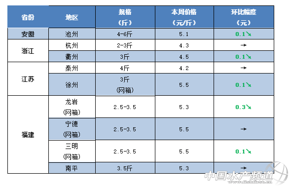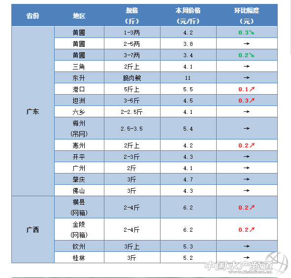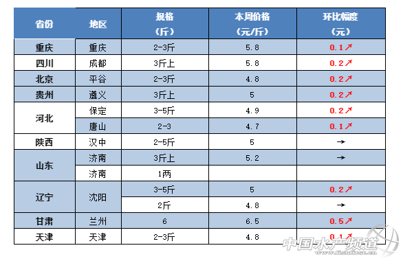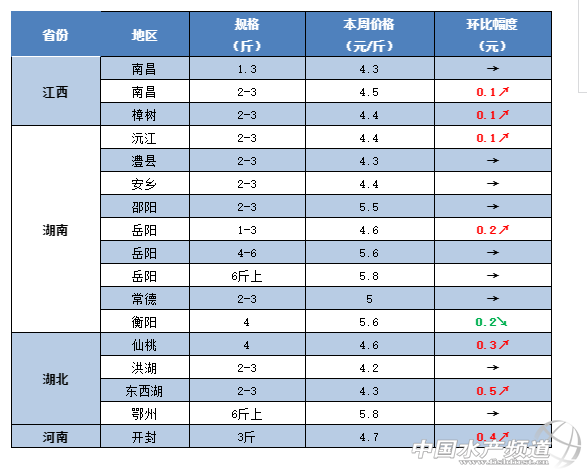 中國水產頻道原創報道, 豬肉最高賣到50元/斤,草魚很快就能暴漲?! 文/水產前沿鄭鵬飛 一周要聞 據了解,受非洲豬瘟的影響,最近豬肉市場多次上演搶豬、搶肉的想象。目前廣東地區的生豬價已經賣到14元/斤,大部分地區豬肉市場價普遍賣到20元/斤以上,廣西南寧最高賣到50元/斤。 豬肉佬半夜搏命搶生豬! 受豬肉瘋漲的影響,魚肉開始成為大家餐桌上不錯的選擇。最近草魚的流通也是有較明顯的好轉,草魚整體行情呈現回暖趨勢。據了解,今天早上佛山環球市場5:00-6:00的時候3-4斤的草魚賣到5.6元/斤;江門地區3斤的草魚塘頭賣4.2-4.5元/斤;茂名地區草魚已經賣到5元/斤;中山地區3斤的草魚塘頭賣到4.5元/斤,養殖戶表示魚比較好賣,行情有上漲趨勢;最近廣西金陵和橫縣地區草魚總算出現好轉,3斤的草魚最新塘頭價賣到6.2元/斤,上漲0.2元/斤;江西南昌地區3斤的草魚最新塘頭價賣4.5元/斤;贛州地區2-5斤的草魚塘頭賣到6.5元/斤;湖南岳陽地區3-4斤左右的草魚賣5元/斤;常德部分地區草魚塘頭價在4.7-5元/斤,繼續保持上漲趨勢;長沙地區3斤的草魚塘頭賣到5.2元/斤;河南開封地區草魚在短暫下滑之后也是再次出現回暖,3斤的草魚最新塘頭價4.7-4.8元/斤,上漲0.4-0.5元/斤;四川成都地區3斤的草魚最新報價5.8-6元/斤,相比上周繼續上漲0.2-0.4元/斤;德陽地區草魚塘頭賣5.6元/斤;自貢地區草魚和鯉魚的塘頭價都在5.2元/斤左右;河北唐山大部分地區3斤的草魚塘頭賣4.7-4.8元/斤,多個地區已經賣到5元/斤,上漲0.2-0.3元/斤,最高的已經賣到5.2元/斤。吉林長春地區3斤的草魚最新塘頭價4.8-4.9元/斤;遼寧沈陽部分地區3斤的草魚賣到5元/斤,上漲0.2元/斤。目前甘肅蘭州市場3斤的草魚最新報價6.5元/斤,較上周上漲0.5元/斤。有養殖戶表示,大家豬肉都吃不起了,草魚不可能一直這么便宜!草魚行情何時能漲,歡迎留言分享! 一周行情 華南地區 受非洲豬瘟的影響,近期各地的豬肉瘋狂上漲,目前廣東的生豬價已經賣到14元/斤,市場上的豬肉普遍賣到20元/斤以上,最近廣西南寧最高已經賣到50元/斤。有養殖戶表示,最近豬肉大家都吃不起了,很多人開始改吃魚了。從最近的市場流通來看,本周華南地區的草魚流通也是有較明顯的好轉,塘頭價格行情呈現緩慢回暖趨勢。據了解,今天早上佛山環球市場5:00-6:00的時候3-4斤的草魚賣到5.6元/斤;目前梅州地區3斤左右的草魚塘頭5.2-5.4元/斤,量少的塘頭賣5.6-5.8元/斤;江門地區3斤的草魚塘頭賣4.2-4.5元/斤,有上漲的趨勢;茂名地區草魚已經賣到5元/斤左右;流通商表示目前中山地區鯽魚行情大漲,草魚行情微漲,3斤的草魚塘頭賣到4.5元/斤;肇慶地區草魚塘頭賣4.7元/斤,養殖戶表示魚比較好賣;目前廣西貴港地區3斤的草魚還是維持在5.2元/斤,桂林地區最新塘頭價賣5.3元/斤,暫時變化不大;金陵和橫縣地區草魚塘頭價開始有所好轉,3斤的草魚最新塘頭價賣到6.2元/斤,上漲0.2元/斤。 梅州:據業內人士介紹,目前梅州地區3斤左右的草魚塘頭價維持在5.2-5.4元/斤,摩托車抓的那種一般量不多,塘頭可以賣到5.6-5.8元/斤。 江門:目前江門地區草魚塘頭價暫時還沒有明顯變化,3斤的草魚塘頭賣4.2-4.5元/斤。養殖戶表示,目前肉價太高吃不起,老百姓就開始轉吃魚了,不過大部分還是偏向中高檔的品種,近期草魚也是有上漲的趨勢。 茂名:從養殖戶了解到,目前茂名地區3斤的草魚最高已經賣到5元/斤,流通有所好轉。 中山:本周中山地區草魚塘頭價也開始出現好轉。據流通商介紹,目前中山的鯽魚行情大漲,草魚行情微漲,3斤的草魚塘頭賣4.5元/斤,較之前上漲0.3元/斤。 佛山:目前佛山地區的草魚塘頭價整體變化不是很明顯,塘頭價基本維持上周水平。從養殖戶了解到,目前南海九江地區3-5斤的草魚塘頭價基本維持在5.1元/斤左右。有流通商反映,今天早上5:00-6:00的時候環球水產市場3-4斤的草魚賣到5.6元/斤,不過后面行情就沒有那么好。批發價就看市場當天的貨量而定,有時候小草魚好賣,有時候大草魚好賣,目前草魚塘頭價還是沒有太大變化。 肇慶:目前肇慶地區3斤的草魚塘頭還是維持在4.7元/斤,暫時還是保持穩定,不過養殖戶表示魚很好賣。 廣西:本周廣西有部分地區的草魚行情總算也開始出現好轉。據了解,目前貴港地區3斤的草魚賣5.2元/斤,價格還是繼續保持穩定;桂林地區3-4斤的草魚塘頭賣5.3元/斤,暫時沒有明顯變化;金陵和橫縣地區3斤的網箱草魚最新塘頭價賣到6.2元/斤,較之前上漲了0.2元/斤。 華中地區 據養殖戶介紹,目前華中地區的豬肉已經賣到20元/斤以上,最近的草魚行情整體還是保持上漲趨勢。據了解,目前江西南昌地區3斤的草魚最新塘頭價賣4.5元/斤;贛州地區2-5斤的草魚塘頭賣到6.5元/斤;樟樹地區小規格草魚塘頭賣4.1-4.2元/斤,大的賣4.4-4.5元/斤。湖南岳陽地區3斤左右的草魚賣5元/斤,2斤的賣4.6元/斤,暫時沒有明顯變化;常德草魚價格有所回升,3斤的草魚塘頭價在4.7-5元/斤;這兩天衡陽地區草魚有小幅下滑,塘頭價下跌0.1-0.2元/斤,最新塘頭價5.6元/斤;長沙地區3斤的草魚塘頭賣5.2元/斤。河南開封地區3斤的草魚塘頭賣4.7-4.8元/斤,較之上漲0.4-0.5元/斤;湖北隨州地區3斤左右的草魚還是維持在6.5元/斤,繼續維持上周水平;仙桃地區草魚基本還是維持上周水平,3斤的草魚塘頭賣4-4.7元/斤。 江西:本周江西地區草魚塘頭價穩中有升,行情繼續保持回暖趨勢。有養殖戶表示,目前南昌的豬肉都賣到20元/斤,不
