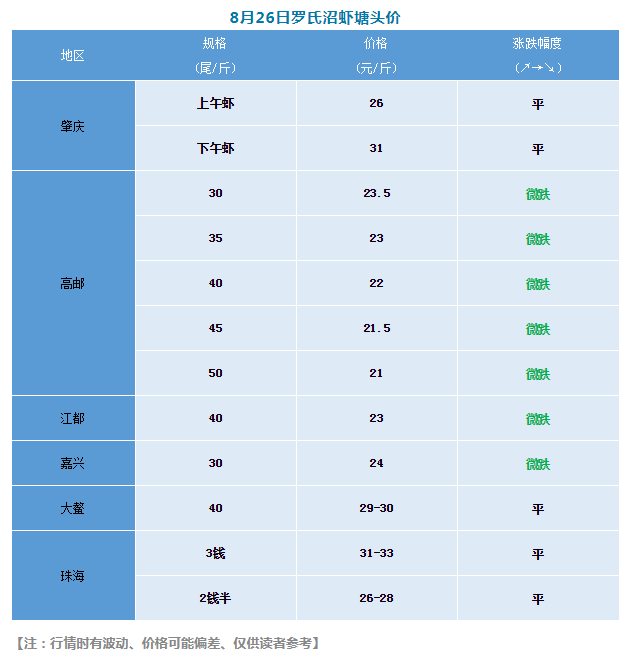 | 中國水產頻道原創報道, 文/ 水產前沿 何鴻浩 本周行情 1、白對蝦價格持續增長 上周白蝦價格持續增長,增幅為2-3元/斤。但白蝦漲價并未能拉動羅蝦、斑節蝦的價格增長。業者表示,目前各地價格比較平穩,若非極端天氣或節假日,價格不會有較大波動。 2、高郵地區正常波動 本周高郵羅蝦價格略微下降,但仍屬于正常波動范圍。目前,養殖戶抓第二網、第三網,出蝦逐漸增多,規格齊全,羅蝦貨源比較充裕,所以價格較穩。 3、近期天氣不美,發病應激多 近期雨水較多、天氣不美,蝦發病增多,從業者建議各位養殖戶做好預警措施,避免因天氣緣故翻塘或減產。 4、暴雨未停,后市未明 雖然臺風“白鹿”減弱,但暴雨未停。南方較多區域都面臨著大暴雨,部分地區強降水之后高溫反撲,天氣反復。養殖端是否會因天氣原因有所變動,需要靜待價格變化。 羅氏沼蝦 羅氏沼蝦 高郵地區價格走勢(數據提供:澳華集團 顧偉) 羅氏沼蝦 斑節對蝦 斑節對蝦(供圖:海南高大尚 彭正德) 日本對蝦、東方蝦 |