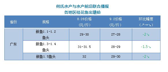 | 中國水產頻道原創報道, 文/圖 何氏水產、水產前沿 李靜 桂花魚 現在廣東桂魚新魚存塘量主要是在1.3-1.4斤為主,1.5斤-1.6魚頭心比例也多了,個別有1.6-1.7斤的魚。新魚價格與上周相比持續下跌1.5-2元/斤,現在1.1-1.2斤魚價格在27-28元/斤,1.3斤-1.4左右魚頭訂魚價格在28-29元/斤,1.5斤魚頭訂魚價格在29-30元/斤,最大魚頭1.6-1.7斤的訂魚價格30元/斤,實際成交價格還要看魚的魚頭及1斤以上比例來定。由于外省新魚也開始陸續上市,出塘規格都是以偏小魚為主,導致市場偏小魚價格持續下跌,上周跌幅收小了,銷量與上周差不多,偏小魚價格接下來還會有小幅下跌空間。上周大標價格下跌幅度也比較大,下跌了6元/斤,接下來價格可能還會有小幅下跌,銷量上漲。現在市場最緊缺中桂以上規格,價格也比上周下跌了5元/斤。接下來價格還會有小幅下滑,大魚頭還是比較受收購商喜歡。 |