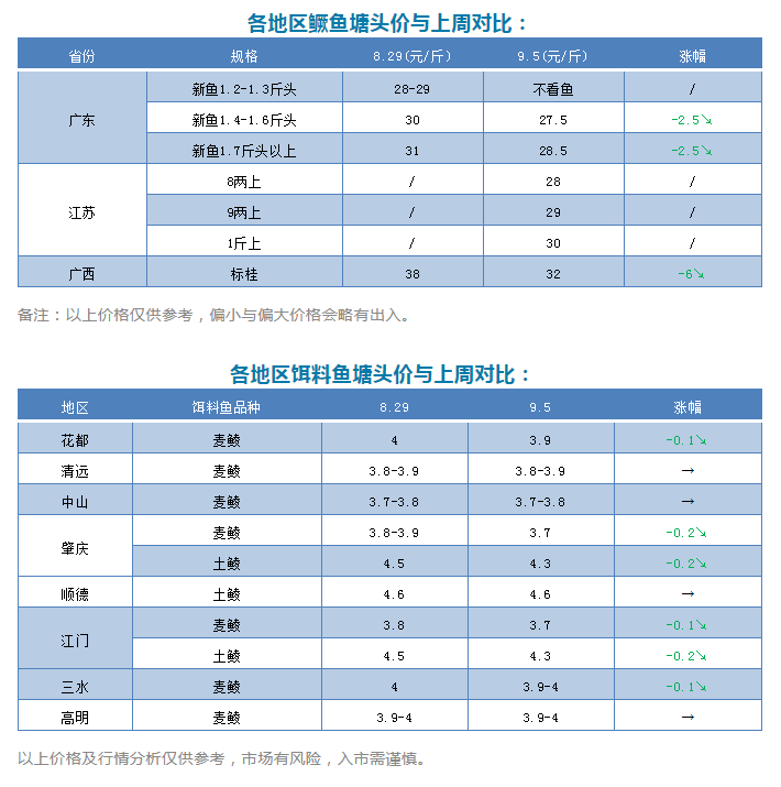 | 中國水產頻道原創報道, 文/圖 鱖鱸前沿 李靜 最近一周,新魚大量上市加上病魚沖擊市場,廣東鱖魚價格繼續下跌了2.5元/斤左右,廣西標桂跌了6元/斤左右,江蘇標桂跌了5元/斤左右。 廣東鱖魚一個月暴跌32元/斤,比去年同期價格低4元/斤 這一個月,廣東鱖魚價格直線下滑,跌幅驚人。今天,新魚1.4-1.6斤魚頭開27.5元/斤左右,魚頭1.7斤以上28.5元/斤左右,魚頭1.4斤以下魚中不想看魚。跟去年同期32元/斤的價格相比,目前鱖魚價格比去年低了4元/斤左右。今年廣東鱖魚價格之所以這么慘不忍睹,流通商表示,主要是受江蘇魚大量上市影響,廣東魚發不上去,只能進凍庫。 江蘇鱖魚不到二十天暴跌17元/斤 江蘇地區從7月中旬鱖魚統貨45元/斤,到今天8兩上鱖魚28元/斤,不到二十天就暴跌了17元/斤。而當地流通商表示,江蘇鱖魚價格之所以大幅下滑,主要是因為發病的鱖魚太多,每天甚至有幾十塘病鱖魚上市。如果鱖魚發病情況不能有效控制的話,近期鱖魚價格也很難回升。 江蘇地區發病死亡的鱖魚 廣西鱖魚上市十天內暴跌6元/斤 廣西新鱖魚上市十天左右了,從十天前標桂38元/斤到今天32元/斤,暴跌了6元/斤,預計接下來新魚陸續上市,價格上漲乏力。 |