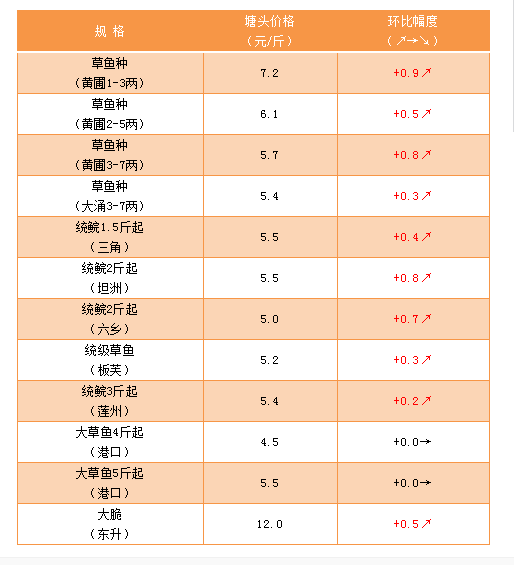 中國水產頻道原創報道, 文/ 珠海海龍 水產前沿 吳佳輝 草魚:價格漲幅大,市場需求大 草魚種和統鯇板塊,由于魚價漲幅大,客戶惜售心態明顯,市場需求量大,后期還會漲。 大草魚和脆肉鯇板塊,市場需求比較穩定,存塘量比較多,價格暫時穩定。 【關鍵字】:草魚 價格 水產養殖 |