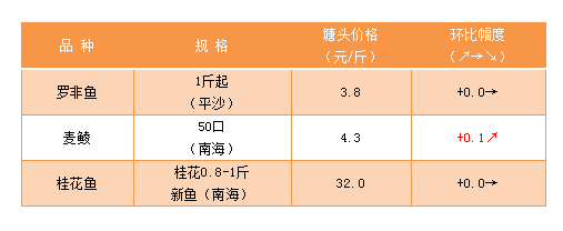 中國水產頻道原創報道, 文/ 珠海海龍 水產前沿 吳佳輝 海水特種魚:海鱸價格已突破13元/斤,后市看好 鱸魚 新魚0.9斤上,10.5元,新魚0.8斤至0.9斤,10.3元。本周鱸魚舊魚價格先揚后抑制,現存塘已不多,雖需求短暫下滑,但預期仍會繼續處于高位。 立魚 珠海小林:小林立魚舊魚存塘減少,天氣穩定,病害減少,預計后市魚價平穩。 珠海斗門:行情穩定。 盲曹 統級0.8-1.4斤12元,1.4斤以上10元。目前存塘量一般,價格會比較穩定。 黃花 受今年總體存塘少影響,價格波動上升,級魚近期上漲至9元,中大魚成數越高價格越高。 其它品種 【關鍵字】:海水特種魚 價格 水產養殖 |
