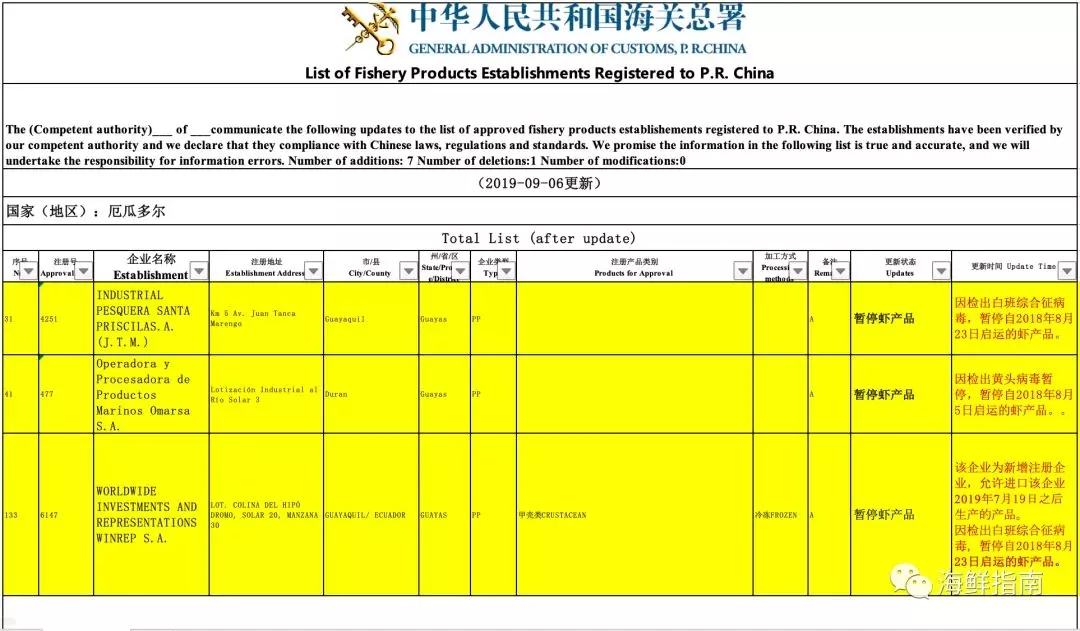 | 中國水產頻道原創報道, 文 / 海鮮指南(seafood-guide) 編輯部 9月6日,海關總署在官方網站公布了對厄瓜多爾三家工廠的禁止準入許可。這三家工廠是:桑塔(SANTA)、歐瑪莎(OMARSA)和溫萊(WINREP)。 海關總署在官方網站公布了對厄瓜多爾三家工廠的禁止準入許可 桑塔工廠在8月23日之后發貨的蝦產品都需要退運,海關總署公布的文件顯示其白蝦中檢查中白斑綜合癥病毒。 歐瑪莎則是因為在其白蝦產品中檢查出了黃頭病毒,歐瑪莎8月5日之后發貨的蝦產品都需要退運。 溫萊工廠為新增注冊企業,允許進口該企業2019年7月19日之后生產的產品,因檢出白斑綜合癥病毒,暫停自2019年8月23日啟運的蝦產品。 退運的費用由厄瓜多爾工廠和買家協商解決。 圖源:海鮮指南據海關總署資料整理 桑塔和歐瑪莎是對中國市場出口量最大的兩家厄瓜多爾工廠,桑塔是厄瓜多爾產量最大的白蝦工廠,在中國市場占有極其重要的市場地位。此次海關總署突然暫停其正關進口許可,對中國厄瓜多爾白蝦現貨市場將會造成極大的影響。特別是現在處于中秋和國慶節前夕,國內白蝦需求增加,暫停桑塔和歐瑪莎正關進口許可后,白蝦市場價格必將再起波瀾。 另一方面,桑塔和歐瑪莎都是厄瓜多爾當地較大的白蝦原料收購商,暫停對中國市場正關出口后,其工廠產量短期之后會受到影響,厄瓜多爾當地蝦農的養殖存塘量會出現積壓。 |