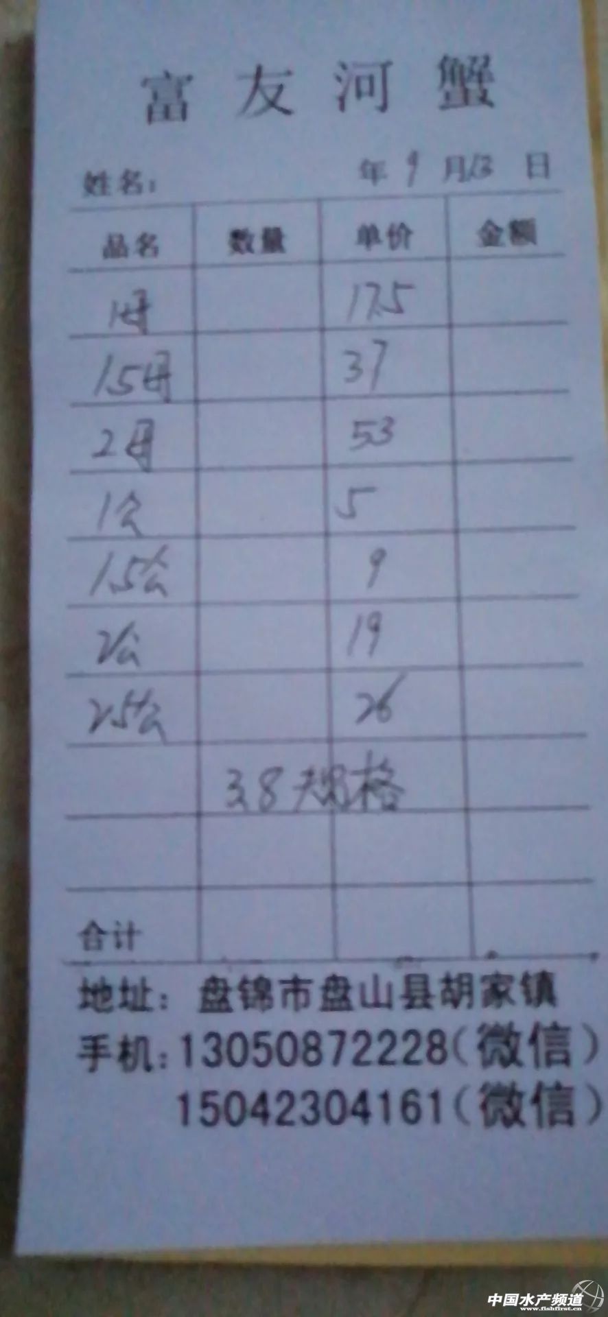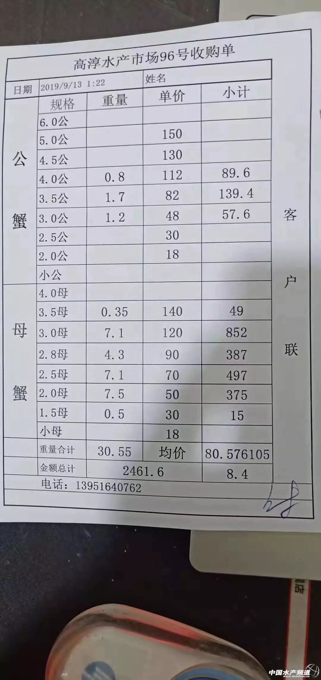 | 中國水產頻道原創報道, 做國內最中立的報價平臺,不被利益綁架,讓養殖者、流通商、零售商與消費者都能第一時間了解最真實的價格與供求數據。 行情分析 與昨天相比,興化行情整體下跌,大規格蟹普遍下跌5元/斤,小規格蟹跌1-2元/斤。如6兩公蟹跌10元/斤,跌價最多。 高淳普通門市漲跌互現,大規格蟹漲,小規格母蟹微跌。如4公漲3元/斤,2母跌1元/斤。 高淳部分高價門市(收精品蟹),3.5公以上和2.5母以上規格補(加)錢4元一斤!3公以下和2母以下補錢2元一斤! 今日交易價 高淳 此報價單由江蘇好潤固城湖店劉坤提供 此報價單由江蘇好潤固城湖店劉坤提供 今日參考價 興化 此報價由江蘇好潤馬家蕩店宋利坤提供 高淳 此報價由江蘇好潤固城湖店劉坤提供 此報價由江蘇好潤固城湖店劉坤提供 盤錦 此報價單由盤錦王老板提供 泗洪 此報價由泗洪孫老板提供 建湖 此報價由江蘇好潤馬家蕩店宋利坤提供 馬鞍山 此報價由江蘇好潤塘南店張悅提供 無錫 |