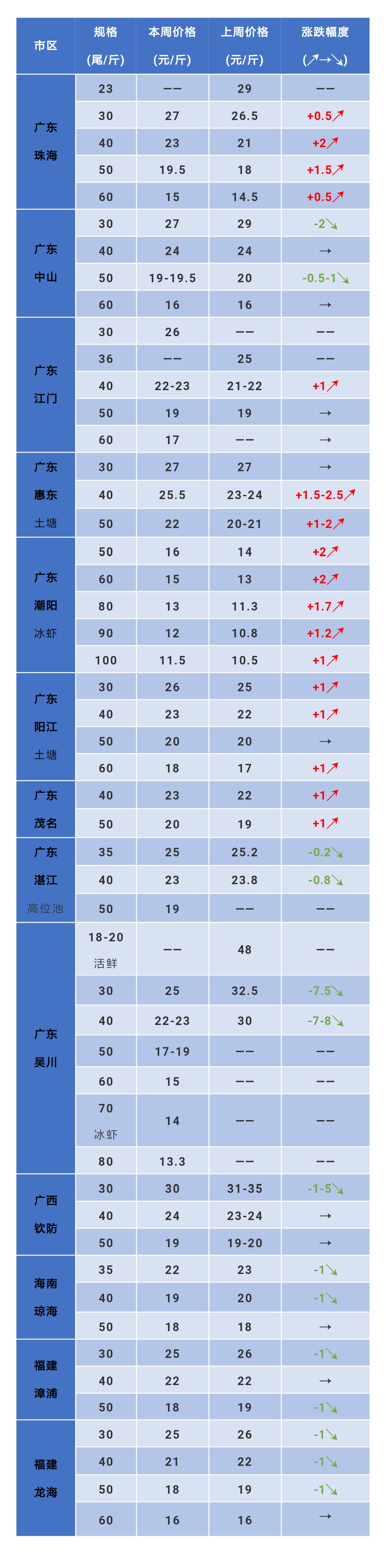 | 中國水產頻道原創報道, 9月18日國內白蝦主產區價格播報與行情分析 文/水產前沿 植銀素 【本欄目由《水產前沿》、“西瑞動保”聯合制定,助各養殖朋友,養得好、賣得好!】 本周行情 經過中秋一輪漲價潮后,本周國內蝦價又呈現出新的動態。其中,北方地區蝦價在節后紛紛降溫,需求下降之后,養殖戶表示“蝦難賣了”。華南地區蝦價漲跌互現,其中珠三角地區價格與中秋期間蝦價相差不大,對比上周整體呈上漲趨勢。潮汕地區蝦存量減少,加工廠也漸漸提價收蝦,而同樣是冰蝦在吳川的價格卻沒有多大變化。還有江門、廣西欽防收購商都表示節日前后蝦價都因為交易一多一少變得混亂,欽防地區蝦價對比中秋期間有明顯下跌。 本周維持穩定有江蘇和福建地區的蝦價。江蘇地區今年沒有臺風打擾,養殖頗順利,價格也比去年同期高出2-3元,養殖戶熱情較高;福建則因為近期成品蝦較少,價格一直都很穩定,但金剛蝦價格則不理想,一直下滑。 近日,國內頻繁傳出進口蝦將減少的消息。據外媒報道,由于擔心白斑和黃頭病毒的傳播,中國禁止了屬于厄瓜多爾的PCC Congeladosy Frescos,Santa Priscila,Expalsa,Omarsa(注:9月16日,海關總署更新的批準的漁業產品企業名單中,Omarsa的禁令被取消)和Winrep五家蝦的進口。消息人士還表示,包括印度一部分蝦類進口將受到影響。 今年1月至7月期間,厄瓜多爾向中國、越南出口了超過5.16億磅蝦。由于今年進口蝦數量激增,國內蝦價一度受影響走下坡路。如果下半年進口蝦減少,對于國內的養殖戶來說絕對是一個好消息。 按照目前的蝦價來說,不少養殖戶都表示看好國慶蝦價,而且部分養殖戶惜售心理較強。至于后市如何,歡迎大家留言交流! 國內部分產區蝦價分析 華南地區 珠三角:30條26-27元/斤,40條22-24元/斤,50條19-19.5元/斤,60條15-17元/斤,本周珠三角地區蝦價整體呈現行情較好的狀態,其中中秋后珠海價格維穩,對比上周同期漲幅較大,而中山和江門都出現上下浮動。 惠東:30條27元/斤,40條25.5元/斤,50條22元/斤。惠州地區中秋蝦價一直高漲,節后價格下降較快,今日蝦價對比上周同期維穩。 陽江:土塘蝦價30條26元/斤,40頭23元/斤,50條20元/斤,60條18元/斤。本周陽江地區蝦價對比上周同期上漲1元/斤,跟中秋期間價格相比價格浮動不大。現在存塘蝦不多,預計國慶期間蝦價仍會漲高,養殖戶存有惜售心理。但是近期開始吹北風,早晚溫差大,不僅有白便,還有偷死情況,養殖戶需謹慎應對。 粵西:湛江高位池35條25元/斤,40條23元/斤;吳川高位池活蝦30條25元/斤,40條22-23元/斤。湛江地區蝦價在中秋期間也表現上漲乏力,本周蝦價仍下行。吳川地區活鮮價格掉價跟節前上漲一樣快,跌幅達到8元/斤,小蝦冰鮮價格也不理想。茂名40條23元/斤,50條20元/斤。茂名地區蝦價對比上周同期上漲1元/斤,目前存塘蝦越來越少,加上蝦中壓價,養殖戶賣蝦意愿不高。 廣西:欽防30條33元/斤,40條24元/斤,50條19元/斤,節后欽防地區蝦價有明顯下滑,但是對比上周同期相差不大,節后交易價格混亂,以質論價,僅供參考。 海南:35條22元/斤,40條19元/斤,50條18元/斤。海南目前仍只有少量蝦上市,節后蝦價下行。 福建:漳浦:30條25元/斤,40條22元/斤,50條18元/斤。龍海:30條25元/斤,40條21元/斤,50條18元/斤,60條16元/斤。福建地區近兩月蝦價都較穩定,都在上下1-2塊錢范圍內浮動,目前存塘蝦規格在50-70頭的多,市場大蝦不多,養殖端空塘較多或剛投苗。 華東地區 江蘇:如東外塘30條24-25元/斤,40條22-23元/斤,50條20-21元/斤,60條20元/斤。鹽城地區20條22-23元/斤,30條21.5元/斤,40條19.5元/斤,50頭17元/斤。對比上周,江蘇地區蝦價基本沒有浮動。今年臺風沒有在江蘇省內登陸,總體來說養殖較為順利,今年蝦價也比去年同期高出2-3元/斤,養殖戶預計國慶還有一定上漲空間。 浙江蕭山:40條21元/斤,50條19元/斤。本周蕭山地區蝦價稍有上漲,整體行情穩定。 北方地區 山東:日照25條26元/斤,30條24元/斤,40條21元/斤。濱洲地區25條26元/斤,30條23元/斤,40條19元/斤。本周山東蝦價整體蝦價下行,節日效應明顯且降溫很快,但是對于山東市場來說算是正常的浮動之內,目前整體土塘存量不足2成,國慶節緊接,預計價格仍會走高,尤其是大蝦的需求會更高。 天津:20條25元/斤,30條20元/斤,40條18元/斤。天津地區本周蝦價對比上周同期下降1元,也是在中秋前一漲一跌。開漁后,大量野生美味海鮮上市引起消費熱潮,白蝦價格一直都趨于平穩,整體蝦存量不足4成。 遼寧:20條25元/斤,25條22元/斤,30條18元/斤。本周營口地區蝦價下滑明顯,節日后需求迅速降溫,活蝦交易下滑明顯,蝦價自然就降了。 |