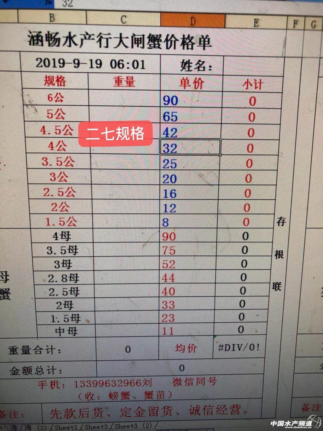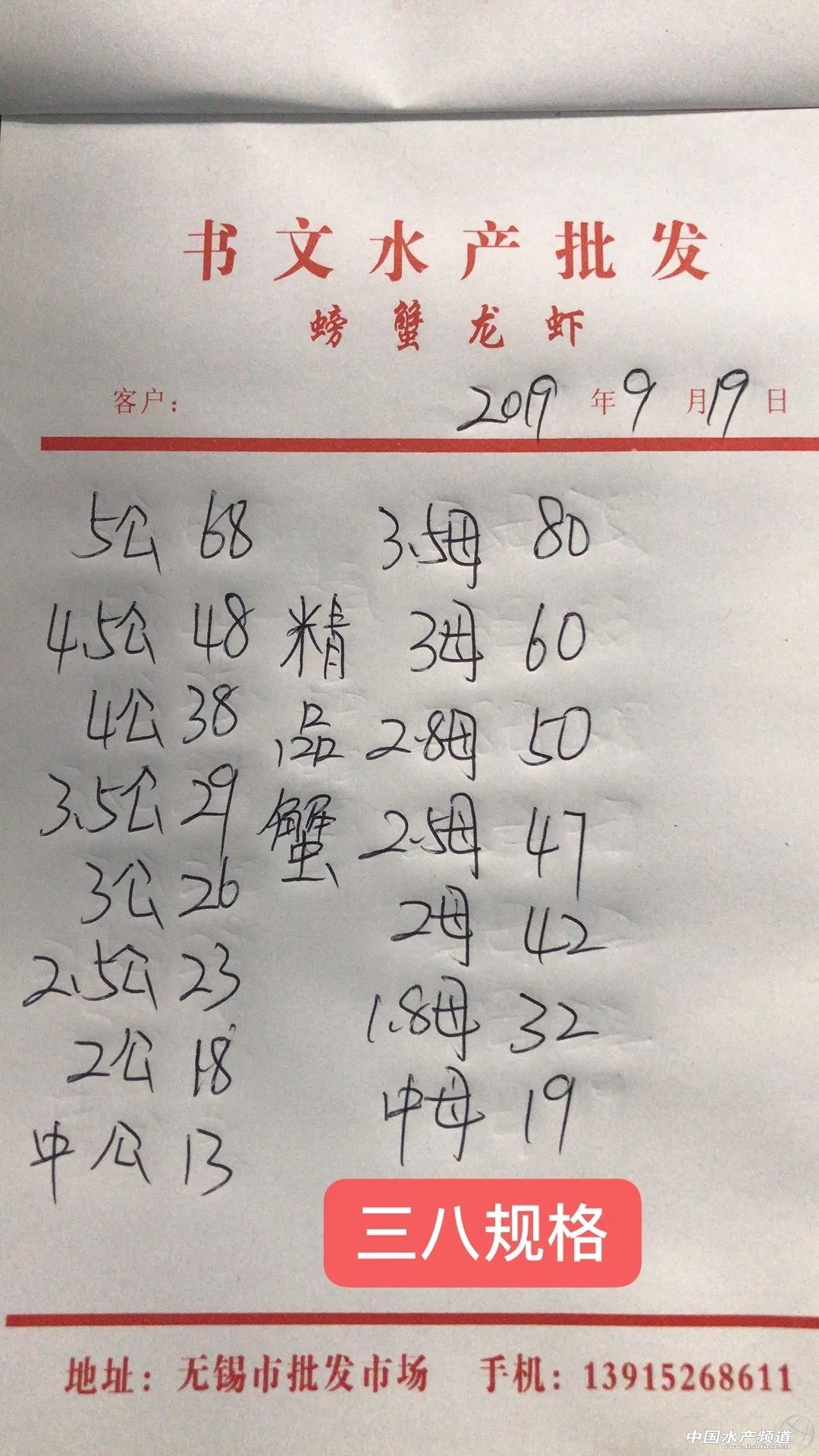 | 中國水產(chǎn)頻道原創(chuàng)報道, 做國內(nèi)最中立的報價平臺,不被利益綁架,讓養(yǎng)殖者、流通商、零售商與消費者都能第一時間了解最真實的價格與供求數(shù)據(jù)。 行情分析 與昨天相比,興化蟹價今天繼續(xù)下跌。大規(guī)格大跌,小規(guī)格小跌。4.5公、3.5母及以上大規(guī)格均跌10元/斤,其他規(guī)格跌1-7元/斤不等。3.5公跌從28元/斤跌至21元/斤,2.5母從43元/斤跌至28元/斤。 高淳今天也繼續(xù)下跌,部分門市一天報價2次,跌價2次,所有規(guī)格無一幸免,跌幅在4-20元/斤。4母從160元/斤跌至140元/斤,2.5母跌4元/斤,4.5公跌10元/斤。 與昨天相比,今天興化大規(guī)格蟹價全部上漲,小規(guī)格蟹價基本持平。4公、3母及以上規(guī)格上漲2-5元/斤,5公由昨天50元/斤漲至55元/斤。 高淳今日普遍上漲,精品門市漲幅較大,普通門市漲幅較小。精品門市小規(guī)格蟹漲2-5元/斤,大規(guī)格蟹漲10-20元/斤。 盤錦1母、1.5母均下跌2元/斤,其他規(guī)格價格基本保持不變。 泗洪基本持平,2公、3公均跌1元/斤,1.5公跌2元/斤,其他持平。 ——蝦蟹前沿 近日交易價 高郵 此報價由江蘇好潤臨澤劉老板提供 興化 此報價由鹽城天邦申亞陽提供 今日參考價 興化 此報價由興化丁老板提供 此報價由江蘇好潤下圩店張玉蘭提供 高淳 此報價由江蘇好潤固城湖店劉坤提供 此報價由江蘇好潤獅樹店田玲提供 此報價由江蘇好潤固城湖店劉坤提供 此報價由江蘇好潤固城湖店劉坤提供 此報價由江蘇好潤固城湖店劉坤提供 盤錦 此報價由盤錦王老板提供 泗洪 此報價由泗洪孫老板提供 宣城 此報價由宣城劉老板提供 無錫 此報價由無錫王老板提供 上海 此報價由上海曹老板提供 |