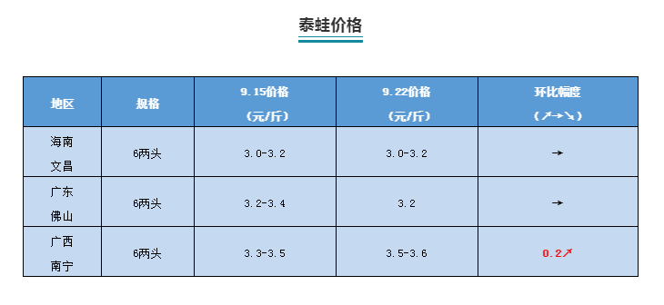 | 中國水產頻道原創報道, 本周牛蛙、黑斑蛙、泰蛙最新行情報價 文/ 水產前沿 陳曉慶 一周行情簡析 牛蛙 本周福建牛蛙價格穩中有跌,今日牛蛙現金價5元/斤,欠賬5.4元/斤。江西、廣西、海南等地牛蛙價格保持穩定,廣西南寧8兩頭4.8-5元/斤,江西地區5.2-5.3元/斤,海南文昌4.5-4.6元/斤,廣東佛山4.8-5元/斤,與上周持平。 目前各地區牛蛙價格仍然處于低價位,即使處于雙節期間也難見起色。近期市場對于大蛙的需求較大,且存量不多,價格有所上調,相比上周上漲了0.2元/斤。中小規格的新蛙由于市場存量過多,市場需求較小,價格微跌。 去年14元/斤的高蛙價驅使著很多養殖戶盲目擴張或是入行,僅廣西今年就擴增了一萬五千多畝,養殖過熱才導致了后市行情的低迷。目前很多養殖戶選擇惜售等待價格,期待國慶節期間能夠有所上漲,但也有業內人士認為,目前的惜售可能會導致后期的集中上市,加上大家都希望能夠在澄海新蛙上市前把蛙賣出,價格想要上漲還是很難。 泰國虎紋蛙 本周廣西泰蛙價格終于觸底反彈,海南、廣東地區泰蛙價格依舊保持穩定。廣西泰蛙近兩天升價1-2毛,南寧本周報價3.5-3.6元/斤,漲價的苗頭開始浮現。據悉,廣東本地上半年早批泰蛙都是5月份左右下苗,8至9月份中旬前為出蛙高峰期,加上9月份要清欄下冬批苗,才導致近期市場上泰蛙過多,價格低迷。據統計,目前廣東泰蛙存欄量同比8月份已減少50%以上,加上國慶假日來臨消費量增加,近期蛙價有望上漲。 青蛙(黑斑蛙) |