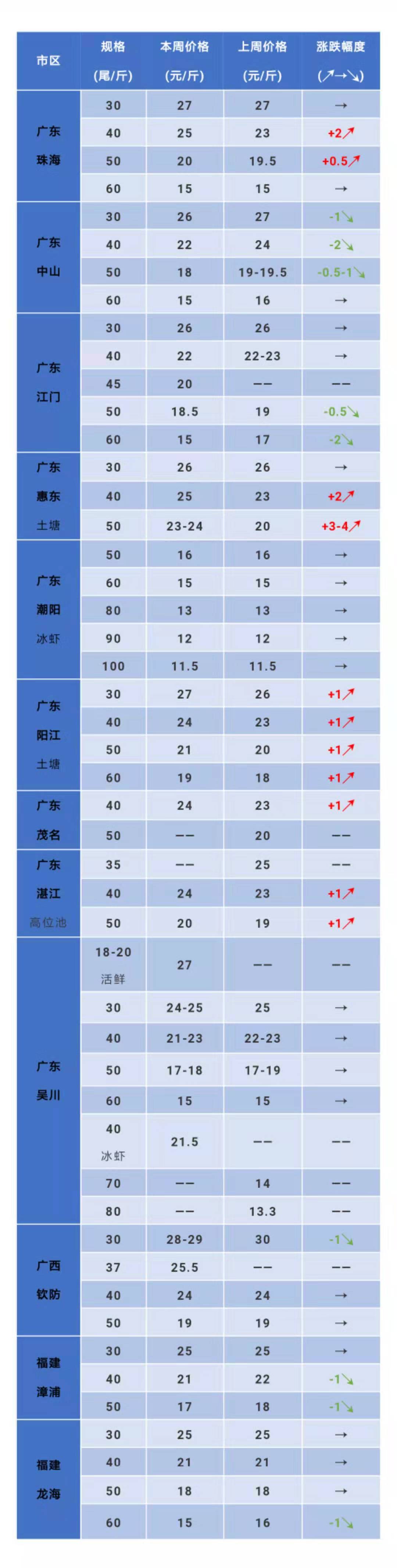 | 中國水產頻道原創報道, 文/水產前沿 植銀素 【本欄目由《水產前沿》、“西瑞動!甭摵现贫ǎ黟B殖朋友,養得好、賣得好!】 本周行情 本周國內各產區蝦價仍保持著一個良好的上漲趨勢。隨著北方部分蝦塘逐漸清空,蝦價上漲較為明顯,目前精養塘基本在清塘倒計時,大水面出蝦為主,也有養殖戶看好國慶蝦價而持蝦待售。同時,據報價員反饋今年山東地區大部分養殖并不順利,蝦產量明顯低于去年同期,日照地區蝦價較去年9月高出5元左右,因此也有不少人看好10月后期價格,在貨源出現空檔期就是蝦價狂歡的時候了。 江浙地區蝦價在本周也開始上漲,如東地區部分養殖戶表示自己今年的產量和售價都比去年同期更為理想。如東地區外塘正值銷售旺季,貨源充足,而鹽城、連云港等地魚蝦混養蝦銷售基本結束,收蝦水車也將陸續調轉如東市場,大蝦近期尤為熱銷,隨國慶臨近或仍有上漲空間。 本周兩廣地區價格以穩定為主,惠東、陽江上漲明顯。秋分后天氣轉涼,養殖難度逐漸加大,養殖戶表現較為謹慎,節前惜售,預計有一定的上漲空間,也有養殖戶表示節后掉價也會很快,建議養殖戶合理出售。 至于后市行情如何,歡迎留言交流! 國內部分產區蝦價分析 華南地區 珠三角:30條26-27元/斤,40條22-25元/斤,50條18-20元/斤,60條15元/斤,本周珠三角地區蝦價整體維穩,中山、江門出現小幅下降,國慶臨近,養殖戶惜售,近期蝦交易量較少,價格就有所降溫。由于天氣開始轉涼,養殖戶要隨時注意調控水質和投喂量,警惕病害入侵。 惠東:30條26元/斤,40條25元/斤,50條23-24元/斤;葜莸貐^中秋蝦價一直高漲,節后價格有所回落,但今日蝦價對比上周同期又漲了2-4元,目前土塘存量有限,養殖戶表示國慶蝦價還有較大的漲價空間。 陽江:土塘蝦價30條27元/斤,40頭24元/斤,50條21元/斤,60條19元/斤。本周陽江地區蝦價對比上周同期再上漲1元/斤,現在存塘蝦不多,預計國慶期間蝦價仍會漲。但是近期開始吹北風,早晚溫差大,不僅有白便,還有偷死情況,養殖戶需謹慎應對。 粵西:湛江高位池40條24元/斤,50條20元/斤;吳川高位池活蝦30條24-25元/斤,40條21-22元/斤。湛江地區對蝦量少價漲,吳川地區活鮮價格與上周同期持平,據了解近期白蝦塘頭交易漸漸熱絡了,行情較穩定。茂名40條24元/斤,茂名地區蝦價對比上周同期上漲1元/斤,目前土塘基本清空,存有大蝦的養殖戶賣蝦意愿不高,部分養殖戶已經標苗。 廣西:欽防30條28-29元/斤,40條24元/斤,50條19元/斤,近期欽防地區塘頭白蝦交易有限,價格變動不大。 海南:40條20元/斤,50條18元/斤。海南目前仍只有少量蝦上市,蝦價上漲。 福建:漳浦:30條25元/斤,40條21元/斤,50條17元/斤。龍海:30條25元/斤,40條21元/斤,50條18元/斤,60條15元/斤。福建地區近兩月蝦價都較穩定,都在上下1-2塊錢范圍內浮動,目前塘口都是陸續在調水、放苗階段,基本到月底大部分放完,交易規格在30-40頭居多。 華東地區 江蘇:如東外塘30條24-25元/斤,40條22-23元/斤,50條20元/斤,60條17-18元/斤。鹽城地區20條23元/斤,30條22元/斤,40條20元/斤,50頭18元/斤。對比上周同期鹽城地區因存量減少蝦價有小幅度上漲,而如東地區大規格蝦價格基本維穩,目前外塘銷售正值旺季,大蝦比小規格蝦更加暢銷,而且貨源充足,小蝦價格對比上周有所下降,走量較少。 浙江蕭山:40條23元/斤,50條20-21元/斤。本周蕭山地區蝦價持續上漲趨勢,而且冰蝦也漲價了,整體行情隨國慶節臨近而上揚。 北方地區 山東:日照25條28元/斤,30條26元/斤,40條22元/斤,60條12元/斤。濱州地區25條25.5元/斤,30條23.3元/斤,40條19.5元/斤。本周山東日照的蝦價上漲明顯,漲幅達到2元/斤,近期天氣轉涼,蝦也開始受到弧菌、孢子蟲等侵害,病蝦上市較多,以小規格蝦為主。對比去年同期,目前存塘蝦少,但是蝦價高出5元左右,對蝦農來說也算另一種“安慰”。 天津:20條26-27元/斤,30條21元/斤,40條18.5元/斤。天津地區本周蝦價對比上周同期上漲1-2元左右,目前精養塘已經清空庫存,大水面還有一些存量,但是需求并不高,養殖戶出蝦意愿較低,大部分都持蝦待價,預計國慶時蝦價又會出現小高峰。 |