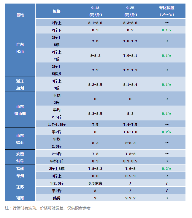 | 中國水產頻道原創報道, 生魚最高賣到9元/斤,流通商暫時手中不缺魚,后市還要漲? 文/水產前沿 林貞武 最新報價、熱點行業資訊 生魚行情周報重磅來襲 每周相約水產前沿 總體行情分析 流通商暫時手中不缺魚,這幾天出貨量超大,價格稍有微跌,日流通量達300萬斤左右,后期有市場,這是廣大業內人士得出的結論。 對于目前價格來說,如果料比控制在1.5以內的話,對比之前在養殖端已有小利可賺,雖然說是比不上去年同期的行情。現在抓魚看規格,2斤上魚頭超5.5.斤上的塘頭價在8.6元/斤左右,4斤頭的報價在8.3元/斤,2斤下的塘頭報價為6.2-6.3元/斤之間。環比上周魚價稍微輕微的下滑,整體呈現平穩的狀態,近些天出魚的人增多,出貨量加大,或許是養殖戶擔心中旬過后行情會有所下跌的原因,出現小高峰的集體出魚現象。各大產區均出現1-2毛錢的下跌。 各產區行情詳解 廣東產區:2斤上7成魚7.9-8.1元/斤左右,環比上周下跌1毛錢左右,最近抓的魚很多是上周高價定的魚,故目前出魚有些魚塘的價格會相對高一些,2斤上5成魚賣價為7.2元/斤,2斤上6成價格為7.6-7.7元/斤之間,本周總體行情變化只能說是“小打小鬧”變化罷了。在大環境比較平穩時候,福建漳州這個地方塘頭家再一次走入眼球,本周最高賣價為9元/斤,主要看規格抓魚,3斤上起抓,魚頭5.5以上1.5成的再次突破9元大關,雖然該地區本周2斤上6成魚塘頭報價僅為7.6-8元/斤之間,對比上周下滑0.2元/斤,整體仍體現出強大的上漲潛力。 本周生魚行情總體略有下滑,但是對這條魚整體發展趨勢我們要對這些信息敏感,首先中秋過后的一頓猛漲打破節后價格下滑的傳統規律,豬瘟帶來的缺肉效應影響深遠,排骨市場都賣到40元/斤了,事實證明今年生魚很有可能繼續走上逆襲之路。另外目前日走貨量大顯示出消費市場的整體容量在逐步變大,300萬斤/日這是一個活生生的數據。從大環境看2018年舊魚日漸消耗,新魚增量少且上市有所延后,給了市場一定的緩沖時間,加上今年整體投苗積極性低于往年,量總體減少,所以我們應該可以對這條魚接下來的行情抱樂觀的態度。這也是筆者在咨詢眾多養殖戶在應對這幾天下跌2毛錢左右的行情時候一些理性的養殖戶朋友的態度,對于這種情況表示不緊張,雖然說短期內可能價格無法快速上漲,但是后市可期,更有人說2斤上可以達到10元/斤。于筆者看來,生魚后市顯然值得期待,手中貨量大的養殖戶可以見好就收,理性出魚。 9月25日生魚塘頭報價 |