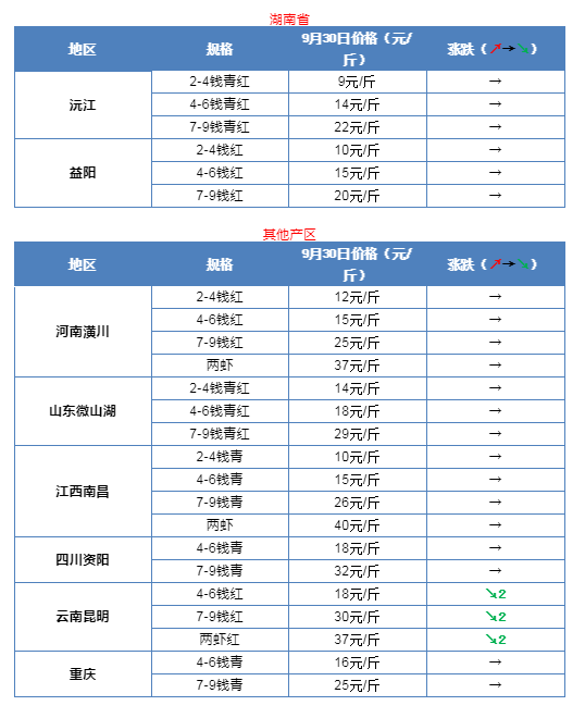 | 中國水產頻道報道, 最新行情解析 今天,云南和湖北多個地區小龍蝦價格再次出現下滑,其他地區批發價沒有出現明顯變化。其中,湖北荊州和監利地區4-6錢均下滑1元,最新報價14元/斤;監利地區7-9錢的蝦下滑2元,最新報價23元/斤;荊州地區7-9錢的下滑1元,報價20元/斤;云南地區整體下滑2元/斤,4-6錢最新報價18元/斤,7-9錢報價30元/斤,兩蝦賣37元/斤。據了解,目前各地區的實際價格甚至更低,部分地區中青甚至賣到11元/斤。往年這個時候蝦價一般都開始有明顯上漲,但今年的價格相比去年同期有明顯下滑。雖然國慶將至,但是蝦價行情卻還是未能看到上漲勢頭。有養殖戶表示,黃岡地區今年8月投的苗到現在只能賣到10-13元/斤,成本都收不會來,還不知道明年的行情會怎樣。為此,很多養殖戶對于明年的行情也表示很擔憂,未來小龍蝦行情將如何走勢,歡迎留言分享! 全國主要產地市場小龍蝦批發價 |