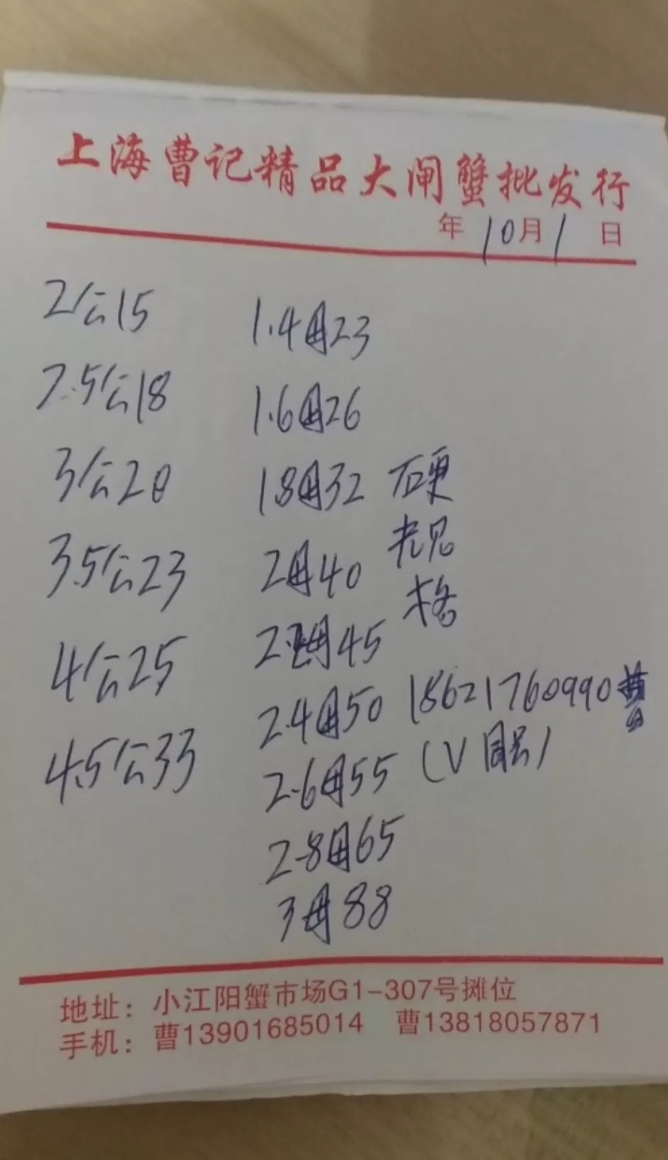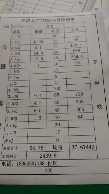 | 中國水產頻道原創報道, 最新行情解析 興化 近期興化蟹價不是很穩定,漲跌互現。繼昨天下跌后,今天迎來一波小幅度的上漲。即使如此,目前的蟹價仍然偏低,與去年相比,價格偏低10%左右。國慶假期,需求量較往常大,蟹價有望維持上漲勢頭。 今天興化除6公、4母蟹價沒有上漲,其他規格均有不同程度的上漲。2公、3.5公、中公上漲3元/斤,中母漲1元/斤,其他規格大多上漲2元/斤。 高淳 本周高淳蟹價起伏較大,昨天下跌后,今天蟹價呈暴漲態勢。但與去年相比,價格仍有一定差距,特別是母蟹,比去年低10-25元/斤。 今天高淳精品門市全線上漲,平均蟹價上漲7元/斤,3母、4.5公暴漲15元/斤,上漲幅度最大。2公、小母等規格也上漲2元/斤。 與此同時,高淳某門市發出公告,建議養殖戶理性看待今年河蟹行情,合理出貨。 高淳某門市公告 今日參考價 興化 此報價由興化丁老板提供 此報價由江蘇好潤永豐店提供 高淳 此報價由江蘇好潤固城湖店劉坤提供 此報價由江蘇好潤獅樹店田玲提供 此報價由江蘇好潤固城湖店劉坤提供 此報價由江蘇好潤固城湖店劉坤提供 泗洪 此報價由泗洪孫老板提供 此報價由江蘇好潤臨淮店賈明先提供 此報價由江蘇好潤臨淮店賈明先提供 馬鞍山 此報價由江蘇好潤塘南店張悅提供 無錫 此報價由江蘇無錫王老板提供 上海 |