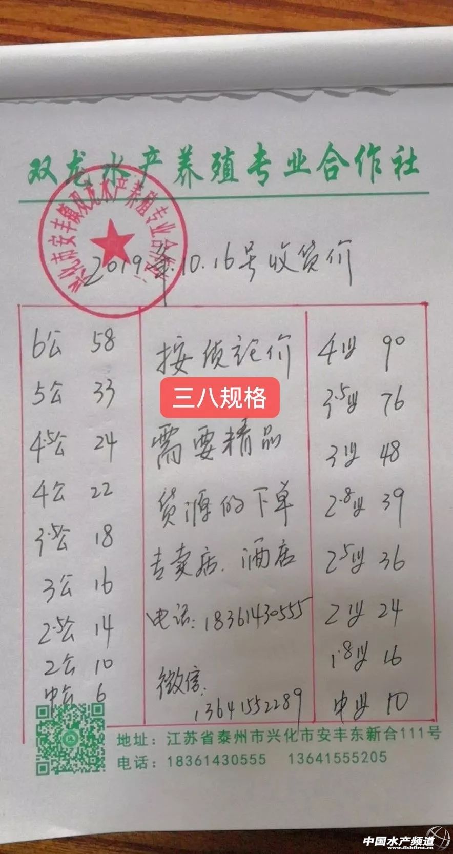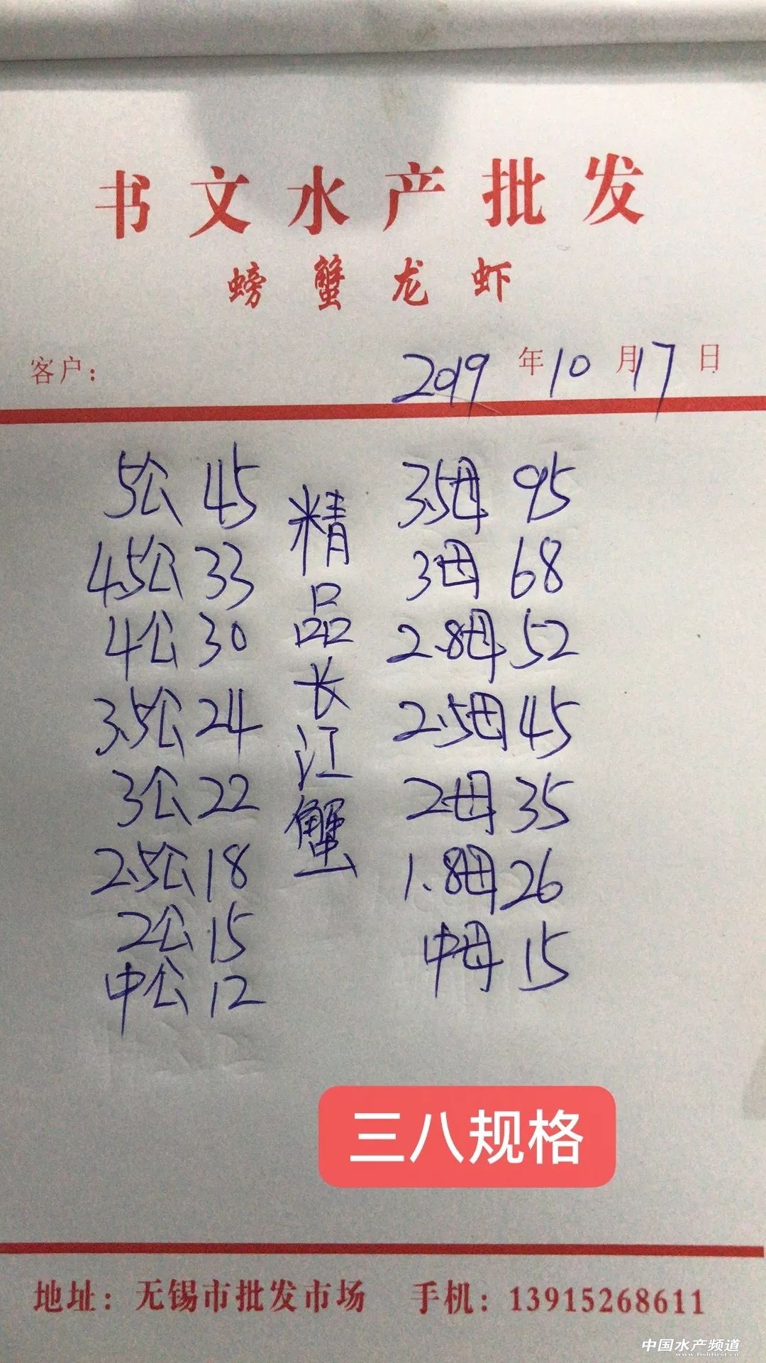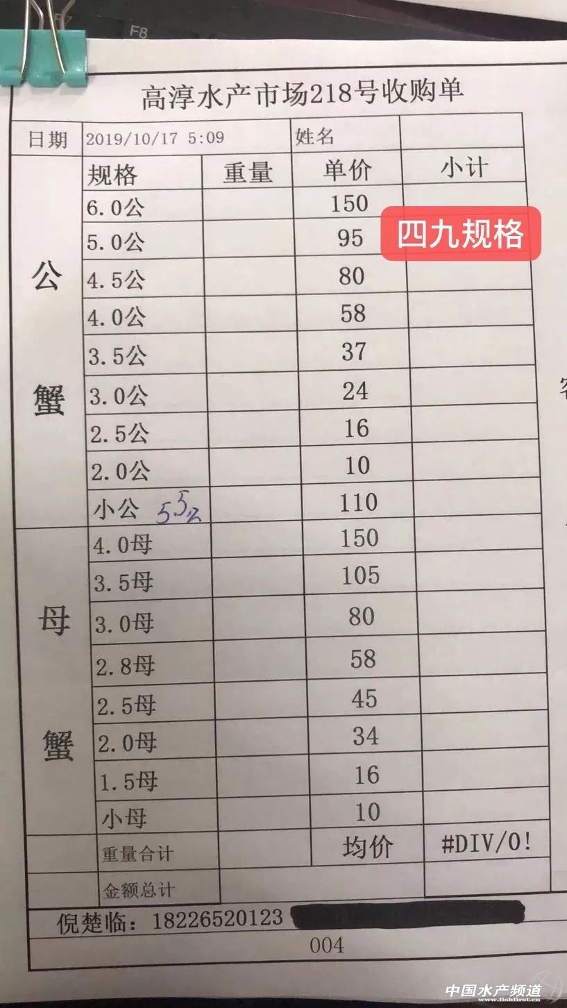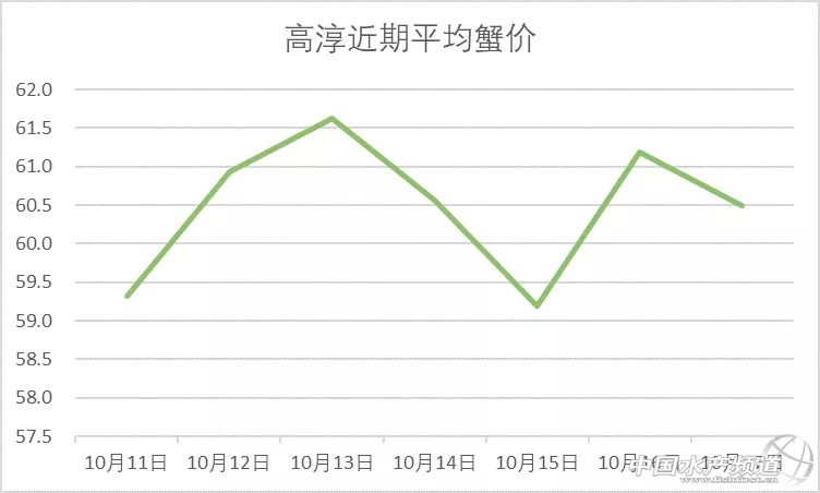 | 中國水產頻道原創報道, 目前行情低迷,價格變化不大。 蝦蟹行情每日播報 您身邊的行情顧問 歡迎關注蝦蟹前沿公眾號! 最新行情解析 興化 自10月13日平均蟹價突破33元/斤后,近期興化蟹價持續走低,今天蟹價與昨天持平,同為近期最低。與去年同期相比,蟹價整體偏低。 今天興化5公跌1元/斤,1.8母漲1元/斤,其他規格蟹價未變。 高淳 近期高淳蟹價波動略為明顯,但價差不是很大,涉及的規格也不是很多。今天高淳平均蟹價較昨天下跌0.7元/斤,平均蟹價仍保持在60元/斤以上。與去年同期相比,目前蟹價明顯偏低。 今天高淳精品門市6公從昨天的160元/斤又跌回150元/斤,1.8母跌1元/斤,其他規格蟹價未變。 今日參考價 興化 此報價由興化丁老板提供 高淳 此報價由江蘇好潤固城湖店劉坤提供 泗洪 此報價由泗洪孫老板提供 無錫 此報價由無錫王老板提供 宣城 |