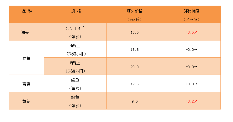 | 中國水產頻道原創報道, 文/ 珠海海龍、水產前沿 吳佳輝 海水特種魚:海鱸市場供不應求,價格上漲 鱸魚:1.0-1.2斤新魚,13元/斤。由于市場供不應求,基本足規格就抓。1.5斤以上鱸魚新魚暫無。鱸魚新魚價格本周繼續上漲,預計會拉動舊魚大魚價格增長,現階段足規格鱸魚存塘依舊較少,需求大,利潤空間樂觀,后續預期價格繼續穩定在高位。 立魚 珠海小林:市場立魚舊魚存塘減少,預計后市魚價穩定。規格5兩以上大魚存塘少,后市看漲! 珠海斗門:行情穩定。 盲曹:0.8-1.4斤統貨價格11元,1.4斤上大魚9.5元,1.6斤上8.5元。打冰9.6元,后市價格不明朗。目前無魚中按級魚0.8-1.2斤分級開魚。 黃花:受今年總體存塘少影響,價格波動上升,級魚近期上漲至9.5元,中大魚成數越高價格越高。 |