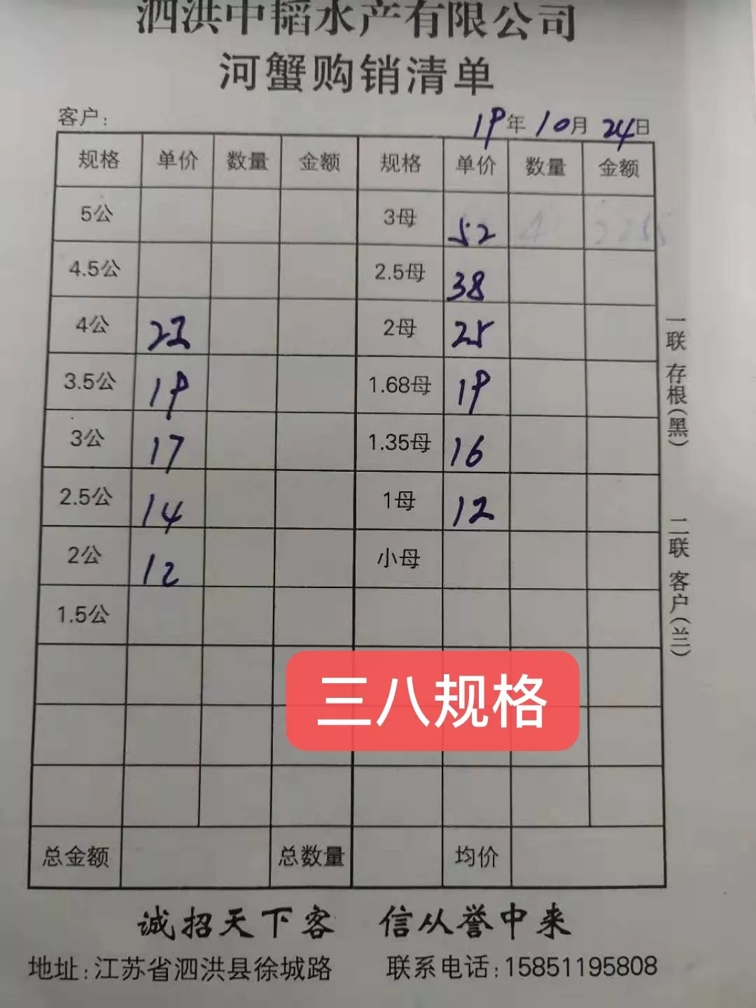 | 中國水產頻道原創報道, 高淳母蟹整體上漲! 蝦蟹行情每日播報 您身邊的行情顧問 歡迎關注蝦蟹前沿公眾號! 最新行情解析 高淳 近期高淳精品蟹價先降后升,昨天達到最低平均蟹價,今天較昨天小幅上漲,目前平均蟹價為56.9元/斤。與去年同期相比,目前蟹價仍舊偏低。 今天高淳精品門市母蟹整體上漲,3.5母漲5元/斤,3母、2.8母、2.5母均漲2元/斤,2母漲1元/斤。公蟹方面,各規格蟹價基本未變。 今日參考價 高淳 此報價由江蘇好潤固城湖店劉坤提供 此報價由江蘇好潤固城湖店劉坤提供 泗洪 此報價由泗洪孫老板提供 此報價由江蘇好潤臨淮店賈明先提供 無錫 此報價由無錫王老板提供 馬鞍山 此報價由江蘇好潤塘南店張悅提供 宣城 此報價由宣城劉老板提供 |