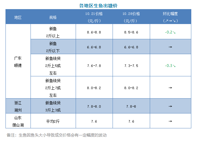 | 中國(guó)水產(chǎn)頻道原創(chuàng)報(bào)道, 文/圖 何氏水產(chǎn)、水產(chǎn)前沿 李靜 生魚(yú) 1、本周廣東生魚(yú)總體情況變化不大,大生市場(chǎng)行情相對(duì)差一點(diǎn),銷量下降,價(jià)格有時(shí)會(huì)出現(xiàn)小幅下跌,F(xiàn)在7成左右統(tǒng)貨價(jià)格與上周一樣,還是8.0-8.2元/斤;成數(shù)在5成左右的價(jià)格下跌0.3元/斤,是7.3-7.5元/斤;本周大生價(jià)格在8.5-8.6元/斤,下跌0.3元/斤;2斤以下市場(chǎng)行情好,價(jià)格保持不變,在6.6-6.8元/斤,最終成交價(jià)格還是要看魚(yú)的規(guī)格和魚(yú)頭大小來(lái)定,F(xiàn)在新魚(yú)魚(yú)頭不大,養(yǎng)戶惜售心理較強(qiáng)。本周生魚(yú)價(jià)格預(yù)計(jì)持穩(wěn),銷量與上周差不多。 2、浙江湖州市場(chǎng)行情與上周差不多,價(jià)格還是在7.8-8.0元/斤,微山湖價(jià)格也與上周差不多,也是7.6元/斤,銷量與上周變化不大。 |