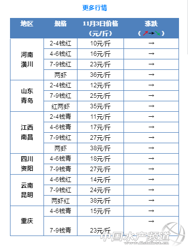 中國水產(chǎn)頻道原創(chuàng)報(bào)道, 多地小龍蝦塘頭價(jià)出現(xiàn)1元/斤的小幅上漲,批發(fā)行情也是穩(wěn)中有升,小龍蝦整體行情繼續(xù)小幅回升! 蝦蟹行情每日播報(bào) 您身邊的行情顧問 歡迎關(guān)注蝦蟹前沿公眾號(hào)! 11月3日全國小龍蝦塘頭價(jià) 11月3日全國小龍蝦市場批發(fā)價(jià) 【關(guān)鍵字】:小龍蝦 塘頭價(jià) 市場批發(fā)價(jià) 水產(chǎn)養(yǎng)殖 |