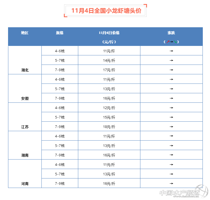 穩!今日小龍蝦行情整體平穩!11月4日小龍蝦塘頭價行情