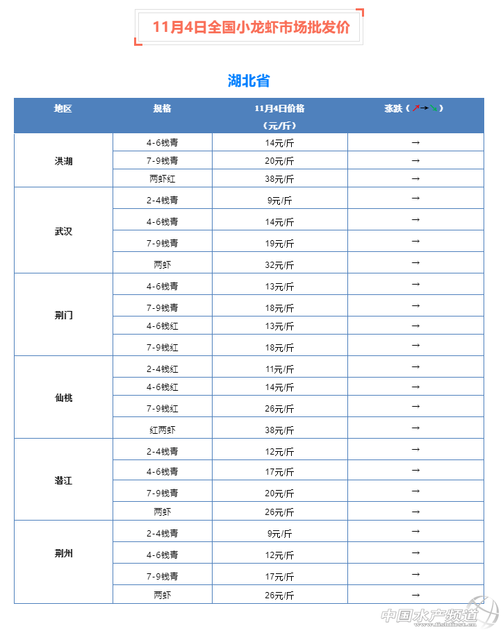 摘要: 中國水產頻道原創報道, 11月4日全國小龍蝦市場批發價 。