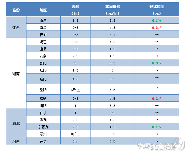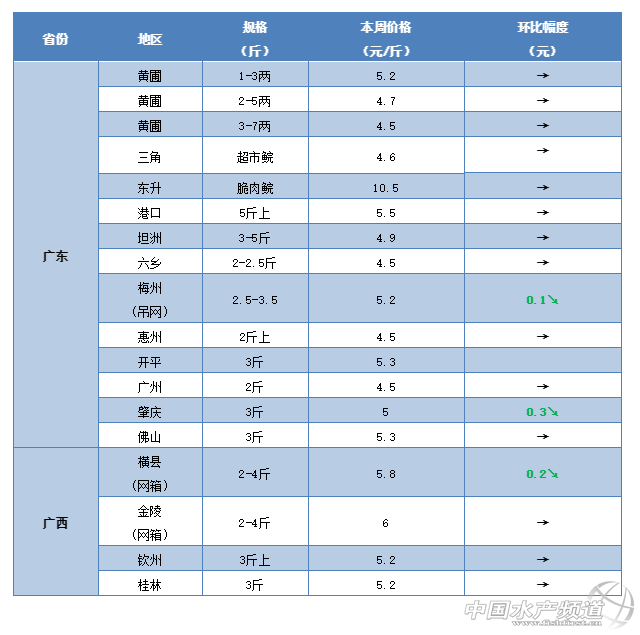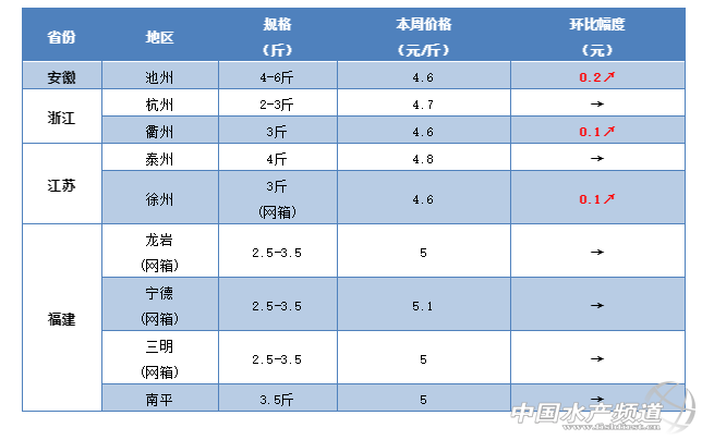 | 中國水產頻道原創報道, 淡水魚幾乎全線下滑,大批草魚被迫集中上市魚價全線下滑,最低賣3.8元/斤! 文/ 水產前沿 鄭鵬飛 日前,廣西來賓市忻城縣紅渡紅水河清理網箱(轉自:忻城家園) 一周要聞 據了解,目前北方養殖戶要趕在冰封前出魚導致了近期出魚的養殖戶較多;養殖戶面臨年底飼料回款壓力被迫賣魚,近期出魚相對比較集中;最近,山東微山湖以及廣西來賓、橫縣等地拆網箱也是導致近期很多魚大量集中上市。在拆網箱、年底飼料回款壓力、魚塘到期等諸多因素影響下,近期魚價整體行情都出現明顯下滑。有養殖戶表示,魚價行情就像現在的天氣一樣,拔涼拔涼的。 來賓市忻城縣紅渡紅水河清理網箱(轉自:忻城家園) 據了解,最近湖北武漢地區鱖魚和鱸魚全線下跌,昨天有魚中一車鱖魚虧了2萬多。目前,武漢白沙洲市場3-5斤的草魚都只賣到4.2元/斤,5-9斤的草魚賣5.1元/斤,2斤的標草只有3.8元/斤,半斤以上的彭澤鯽賣5元/斤。湖北隨州地區3斤以上的草魚賣4.8元/斤,最高下滑0.7元/斤。目前廣東江門3斤的草魚塘頭賣4.6元/斤,最高下滑0.4元/斤;肇慶地區3斤左右的草魚最新塘頭價賣5元/斤,下滑0.3元/斤。河北唐山地區3斤的草魚最新塘頭價賣4.6元/斤,最低賣到4.4元/斤,7-8兩的鯽魚賣6元/斤。甘肅蘭州市場3斤以上的草魚上周最低價還可以賣到5.7元元/斤,目前最低價只賣到5元/斤。四川成都地區的批發市場受外地草魚沖擊,3斤的草魚賣5.3元/斤,下滑0.2元/斤;眉山地區3斤以上的草魚塘頭賣5.4元/斤,下滑0.2元/斤。遼寧沈陽地區3斤的草魚最新塘頭價賣4.5元/斤,下滑0.2元/斤。 廣東江門草魚出現上漲 福建閩江地區魚市情況 不過,有養殖戶反映最近江門部分地區3斤的草魚最新塘頭價賣到5.3元/斤,上漲0.3元/斤;湖南常德地區3斤的草魚最新報價4.4-4.5元/斤,上漲1-2毛錢;江西南昌部分地區3斤以上的草魚塘頭價賣到4.3元/斤,上漲0.3元/斤。受冷空氣影響,東北一些地區已經開始冰封,明天吉林長春的最高氣溫也只有-2℃,最低氣溫降到-12℃。天氣越來越冷了,接下來草魚行情能否出現好轉呢?歡迎留言分享! 一周行情 華南地區 廣州:最近廣東的草魚市場受華中地區草魚沖擊比較嚴重,草魚行情暫時沒有出現好轉,局部仍有小幅下滑。目前廣州番禺地區統鯇的塘頭價基本還是維持在4.5元/斤左右,基本維持上周水平。 中山:目前中山地區3斤的草魚最新塘頭價在4.5元/斤,局部地區相比上周有1-2毛錢的小幅上漲;部分養殖戶塘頭3斤的草魚可以賣到5.1元/斤。據了解,目前珠三角地區的最高氣溫還有27℃左右,明天廣州的最高溫甚至達到30℃。雖然冷空氣不斷南下,但是影響廣東還是不太明顯,這也導致了目前廣東脆肉鯇的出魚,大草魚的行情也是受到很大影響。養殖戶表示,草魚回暖只能等天氣真正冷下來才行。 江門:最近江門地區淡水魚行情整體出現下滑,目前3斤的草魚塘頭賣4.6元/斤,最高下滑0.4元/斤。不過,也有養殖戶反映江門部分地區3斤以上的草魚升了一點點,最新塘頭價已經可以賣到5.3元/斤,上漲0.3元/斤。 肇慶:本周肇慶地區的草魚行情相比之前也是出現了一定的下滑。目前3斤左右的草魚最新塘頭價賣5元/斤,較上周下滑0.3元/斤。 佛山:最近佛山地區的草魚行情基本還是保持穩定。養殖戶表示,南海九江地區草魚統級魚的塘頭價基本還是維持在5.6元/斤,最近5斤以上的流通量比較大。 梅州:從業內人士了解到,下個月很多養殖戶即將面臨回款,使得近期出現草魚出魚相對比較集中,價格也是呈現下滑趨勢。目前3斤左右的草魚最新塘頭價在5.2元/斤之間,下滑0.1元/斤。 廣西:據了解,在環保壓力下最近廣西橫縣地區拆網箱導致草魚大量上市,部分地區草魚塘頭價有下滑趨勢。從養殖戶了解到,目前金陵部分地區3斤以上的網箱草魚最新塘頭價5.8元/斤,較之前下滑0.2元/斤;桂林地區3斤左右的草魚塘頭賣5.2-5.3元/斤,貴港地區3斤的草魚最新塘頭價5.2元/斤,基本保持穩定。 華中地區 湖南:本周湖南地區的草魚行情整體上還是低迷,不過局部地區塘頭價較上周出現了小幅上漲。從養殖戶了解到,目前常德地區3斤的草魚最新報價4.4-4.5元/斤,相比之前上漲1-2毛錢;岳陽地區3斤左右的草魚塘頭賣4元/斤,繼續維持原價;永州地區3斤以上的草魚塘頭賣5元/斤,養殖戶表示魚不好賣;邵陽地區3斤的草魚塘頭賣5.2元/斤,價格繼續保持穩定。有養殖戶表示,自己養了100多畝水面,目前還有十幾萬斤魚沒有賣,行情一直不見起色,頭都大了。 湖北:本周湖北地區的草魚行情整體呈現下滑趨勢。有養殖戶表示,現在的魚價就像現在的天氣一樣,拔涼拔涼的,只有白鰱不愁賣,其他魚行情全線下跌。據養殖戶介紹,目前武漢白沙洲市場3-5斤的草魚買4.2元/斤,2斤的標草賣3.8元/斤,5-9斤的草魚賣5.1元/斤,半斤以上的彭澤鯽賣5元/斤;最近鱖魚和鱸魚全線下跌,昨天有魚中一車鱖魚虧了2萬多。目前隨州地區3斤以上的草魚賣4.8元/斤,相比上個月底最高下滑0.7元/斤。洪湖地區3斤草魚最新報價4.3元/斤,養殖戶表示魚不好賣。仙桃地區3斤的草魚塘頭價基本還是維持在4元/斤左右,暫時沒有太大變化。 江西:最近江西的草魚塘頭價整體上繼續保持穩定,局部地區有漲有跌。據了解,目前南昌部分地區3斤以上的草魚塘頭價賣到4.3元/斤,相比之前上漲0.3元/斤;小規格的草魚塘頭價有所下滑,1斤以上的草魚最新塘頭價3.8元/斤,下滑0.1元/斤。新余、樟樹、宜