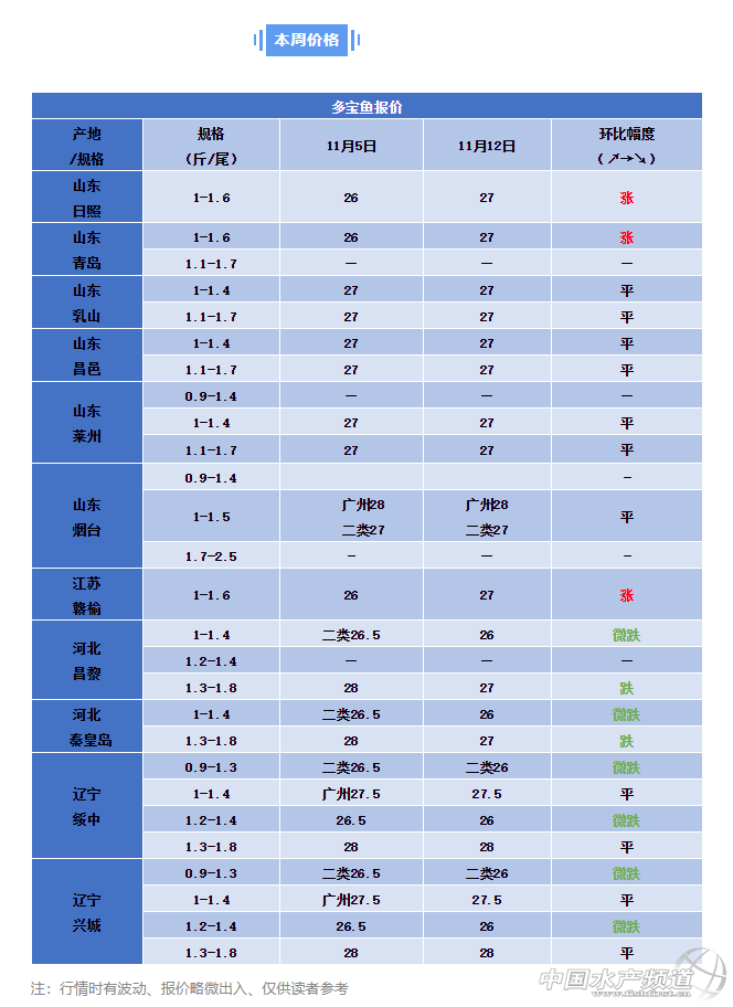 | 中國(guó)水產(chǎn)頻道原創(chuàng)報(bào)道, 一周多寶魚(yú)價(jià)格播報(bào)及分析 文 | 表 工業(yè)化水產(chǎn)圈 植銀素 本周行情 本周多寶魚(yú)價(jià)格漲跌互現(xiàn),山東地區(qū)收購(gòu)商表示繼上周上漲后養(yǎng)殖戶惜售心理減弱,出魚(yú)量相對(duì)正常,價(jià)格逐漸穩(wěn)定。河北、遼寧地區(qū)魚(yú)價(jià)出現(xiàn)小幅調(diào)整,養(yǎng)殖戶表示魚(yú)價(jià)漲價(jià)后每天都落價(jià)0.5-1元/斤,海鮮市場(chǎng)走量慢直接影響了塘口價(jià)格,近期消費(fèi)需求減弱是魚(yú)價(jià)下跌的主要原因。 多寶魚(yú)價(jià)格受節(jié)假日消費(fèi)影響較大,每年的7-10月份受婚慶、暑假、升學(xué)宴、黃金周等消費(fèi)熱點(diǎn)影響會(huì)是其價(jià)格的高峰期。有流通商表示這一輪漲價(jià)結(jié)束后,養(yǎng)殖戶有可能等到春節(jié)才會(huì)有新的上漲。 清蒸多寶魚(yú) 用料:多寶魚(yú)、料酒、鹽、蔥段、姜絲、紅菜椒、蒸魚(yú)豉油 做法步驟: 第一步:把多寶魚(yú)清洗干凈,放入盆中,再加入料酒、食用鹽、蔥段和姜絲,在魚(yú)的身上涂抹均勻,腌制15分鐘。 第二步:15分鐘后把魚(yú)取出來(lái),放入盤(pán)子中。魚(yú)的底下要用兩根筷子撐著,讓魚(yú)和盤(pán)子之間留有空隙。在魚(yú)的身上再放上一些蔥段和姜絲、水開(kāi)之后把魚(yú)放入蒸鍋,蓋上蓋子蒸7分鐘左右。 第三步:準(zhǔn)備一把小蔥、生姜、紅菜椒,都切成絲。魚(yú)蒸好之后取出來(lái),把魚(yú)身上的蔥姜去掉,取出筷子。 第四步:沿著盤(pán)子的邊緣倒入蒸魚(yú)豉油,讓蒸魚(yú)豉油流到魚(yú)的身下,在魚(yú)的身上撒上蔥絲姜絲辣椒絲,用燒好的熱油澆一下,激發(fā)出小蔥的香味,然后就可以吃了。(圖文均來(lái)自于網(wǎng)絡(luò),侵權(quán)刪!) 希望所有的多寶魚(yú)養(yǎng)殖戶加強(qiáng)溝通,讓信息更通暢一些,每個(gè)人都能賣出高價(jià),好價(jià)! |