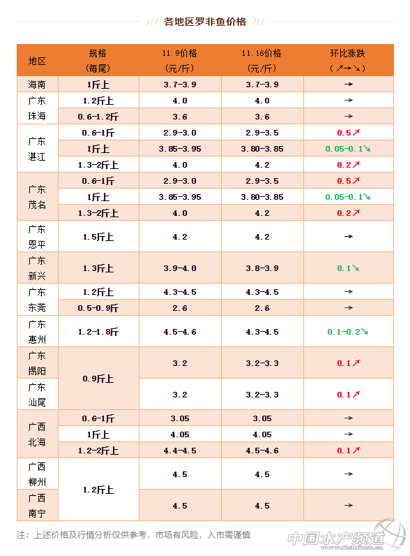 | 中國水產頻道原創報道, 這周加工廠減少了1斤以上規格訂單 文/ 水產前沿 葉豐齊 海南地區:羅非魚行情穩定保持,1斤以上規格3.7-3.9元/斤。 珠三角地區:0.6-1斤規格進加工廠羅非(廠非)3.6元/斤,同上周;1.2斤以上規格走市場羅非(市場非)約4元/斤,同上周;東莞羅非存塘量多,爛市難出,1.2-2斤以上規格市場非4.3-4.5元/斤,0.5-0.9斤規格中非2.6元/斤,皆同上周;恩平1.5斤以上規格市場非約4.2元/斤,同上周;1斤上廠非3.6元/斤,環比上周下跌0.1元/斤;新興抓1.3斤以上市場非,到手價3.8-3.9元/斤,環比上周下跌0.1元/斤;目前存塘量大,出魚緩慢,冷空氣來臨,降溫或將刺激出魚。 粵東地區:惠州1.2-1.8斤規格市場非約4.3-4.5元/斤,環比上周下跌0.1-0.2元/斤;揭陽、海豐兩地每天至少出10萬斤廠非;揭陽9兩以上進凍廠規格廠非3.2-3.3元/斤,環比上周上漲0.1元/斤;汕尾9兩以上進凍廠規格廠非3.2-3.3元/斤,環比上周上漲0.1元/斤;汕尾1斤以上規格的市場非約4元/斤,同上周;海豐同規格市場非4元/斤,同上周行情。 粵西地區:本地魚不多,以外地魚為主;湛江、茂名兩地1.3-2斤以上規格市場非約4.2元/斤,環比上周上漲0.2元/斤,總體來看抓魚甚少;這周加工廠減少了1斤以上規格訂單,又偏好小規格羅非,塘頭價約2.9-3.0元/斤,最高可達3.5元/斤,環比上周上漲0.5元/斤;兩地1斤以上規格廠非約3.8-3.85元/斤,環比上周下跌0.05-0.1元/斤。 廣西地區:北海廠非0.6-1斤3.05元/斤,1斤上廠非約4.05元/斤,同上周;1.2-2斤以上規格市場非約4.5-4.6元/斤,環比上周上漲0.1元/斤;南寧和柳州目前清塘出魚,南寧和柳州1.2-1.5斤左右規格市場非約4.5元/斤,同上周價格。 |