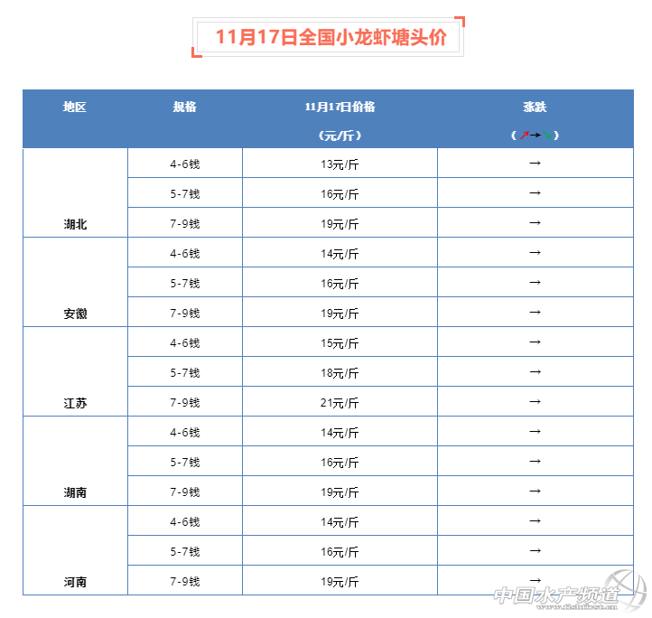 摘要: 中國水產頻道報道, 11月17日全國小龍蝦塘頭價 。