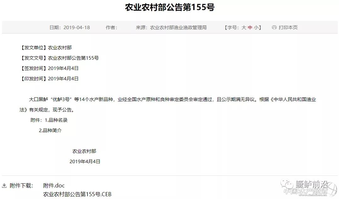 | 中國水產頻道原創報道, 目前大口黑鱸“優鱸3號”仍未正式推向市場,預計在不久的2020年即將上市 文/ 鱖鱸前沿 李曉欣 日前,筆者從廣東梁氏水產種業有限公司董事長梁健輝獲悉,大口黑鱸“優鱸3號”加盟企業已經覆蓋廣東、江蘇、浙江、湖北、四川、重慶等省,具體名單包括:佛山市三水白金水產種苗有限公司、蘇州市未來水產養殖場、眉山偉繼水產種業科技有限公司、湖州湖旺水產種業有限公司、蘇州聚福水產有限公司、重慶市三峽生態漁業股份有限公司、監利縣天瑞漁業科技發展有限公司共7家。 “目前已確定的加盟企業名單是這7家,先試運行一下!睋航≥x董事長介紹,大口黑鱸“優鱸3號”采用“特許加盟合作”推廣模式,只有加盟苗企才能繁殖和銷售種苗“優鱸3號”。 2019年4月4日,農業農村部發布公告稱,大口黑鱸“優鱸3號”等14個水產新品種經全國水產原種和良種審定委員會審定通過。 品種名錄 此后,坊間關于大口黑鱸“優鱸3號”何時上市及其正規購買渠道的關注和討論度都很熱烈,甚至還有一些不法商家打著“優鱸3號”的名號在賣苗。然而,筆者從梁健輝董事長了解到,目前大口黑鱸“優鱸3號”仍未正式推向市場。 “大口黑鱸‘優鱸3號’要到明年再一起推出,具體時間未定,不過很快了!绷航≥x董事長說到。 關于大口黑鱸“優鱸3號” 1、品種登記號:GS—01—001—2018 2、親本來源:大口黑鱸“優鱸1號”和大口黑鱸北方亞種引進群體 3、育種單位:中國水產科學研究院珠江水產研究所、廣東梁氏水產種業有限公司、南京帥豐飼料有限公司 |
