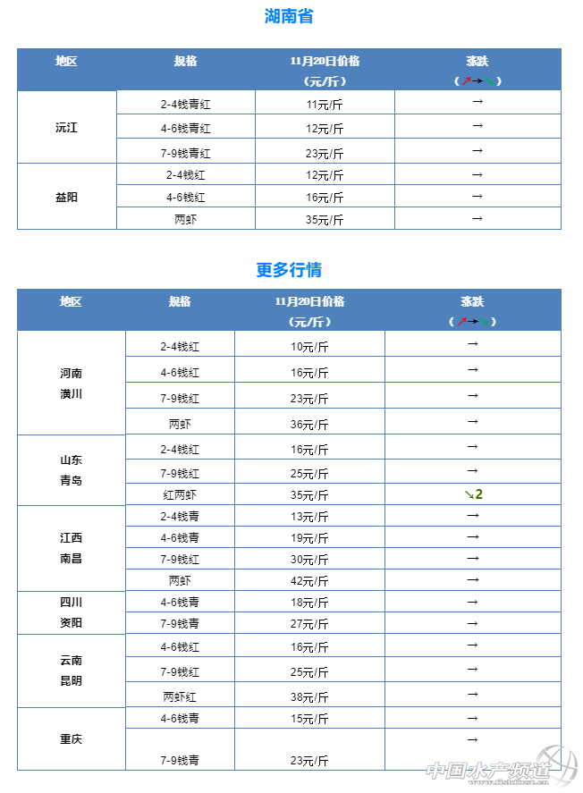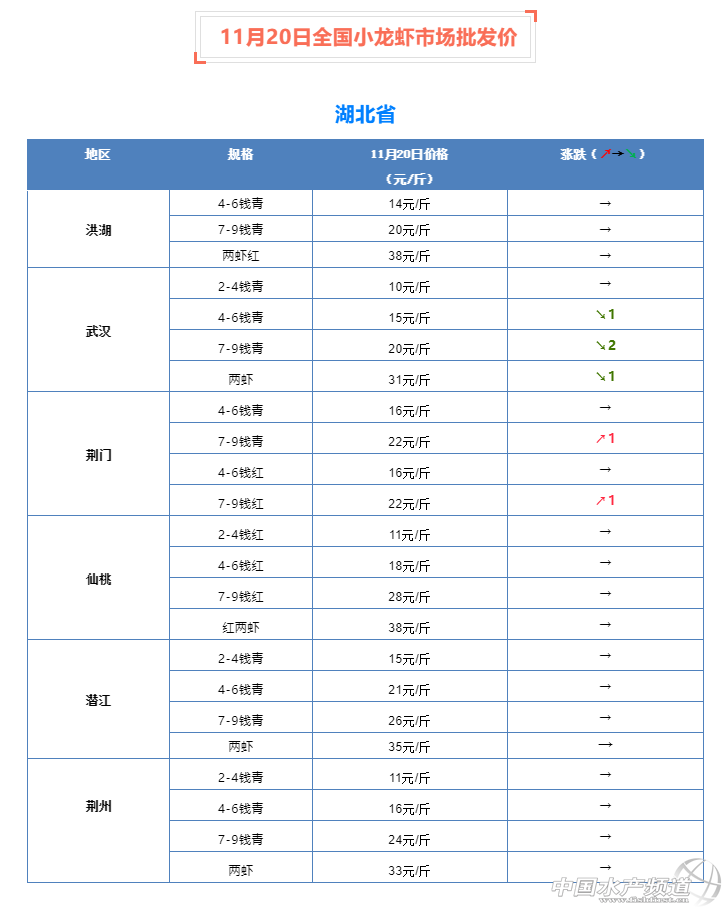 摘要: 中國水產(chǎn)頻道報(bào)道,11月20日全國小龍蝦市場批發(fā)價(jià) 。